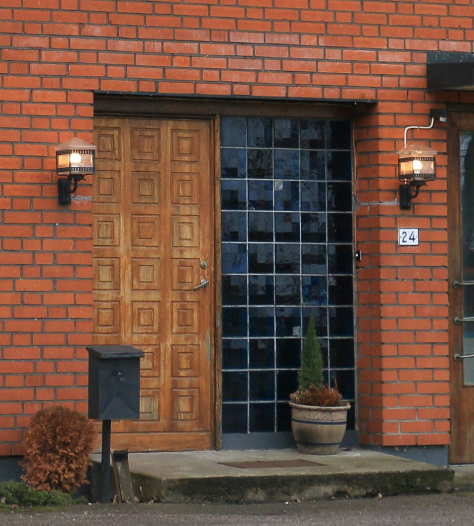 Denna byggnad på fastigheten Eken 9 uppfördes som den sista i gruppen mellan 1963 till 65. Den skiljer sig i sin yttre gestaltning tydligt från de andra. Fasaderna är inte vitputsade utan i rött tegel, taket är täckt med svarta betongpannor, fönstren är perspektivfönster med mörkbruna bågar och inte längre ospröjsade tvåluftsfönster. Entrépartiet består av en fernissad ekdörr och ett glasblocksparti med ursprunglig, utanpåliggande blåfärgad glasmosaik.