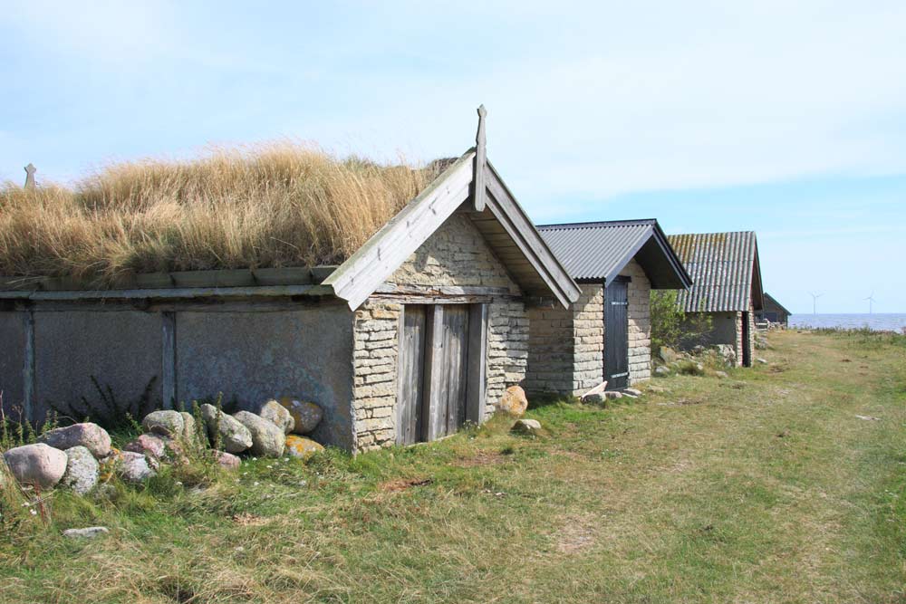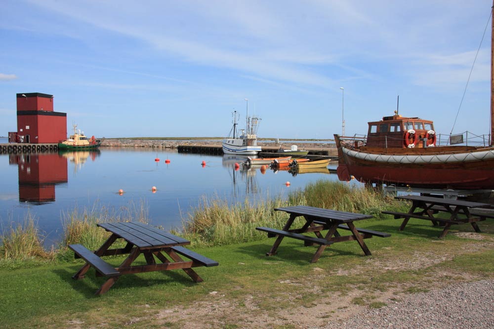 Hamnläge med lång kontinuitet, sjöbodar och sjömärke av kalksten.