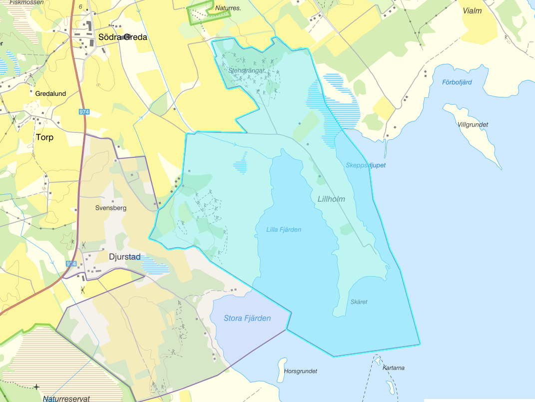 Öppet och välbetat utmarksområde med förhistoriska gravfält, välbevarade stenmurar i gränserna efter utmarksdelningen och samfällda sjöbodplaner, utstakade i samband med 1800-talets skiften, ned mot Kalmarsund.