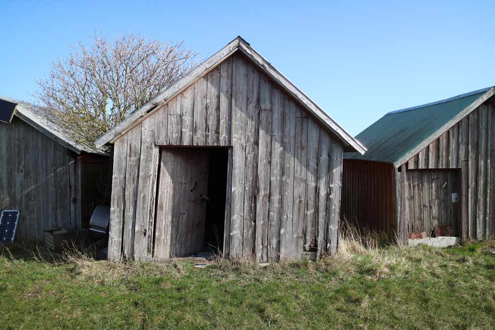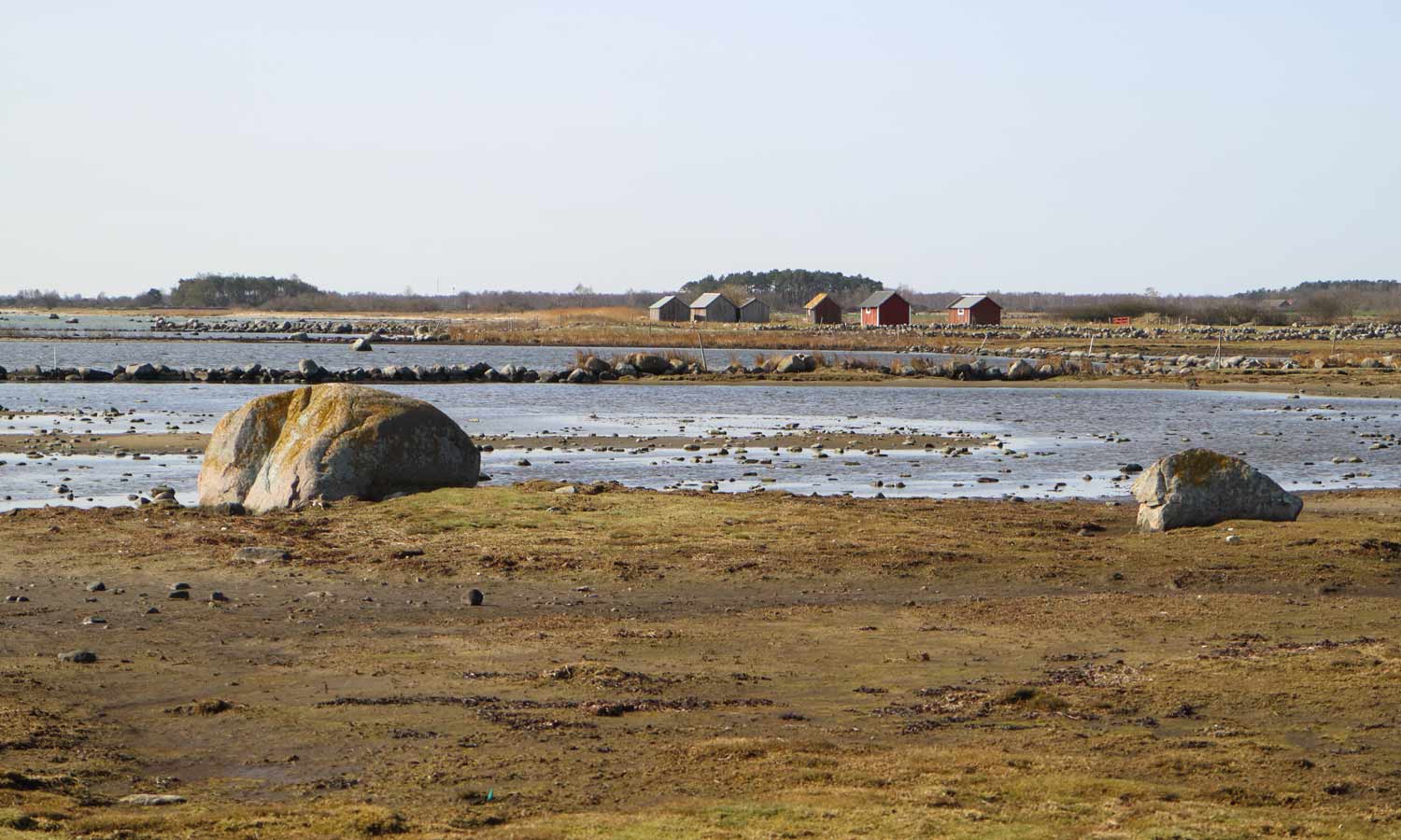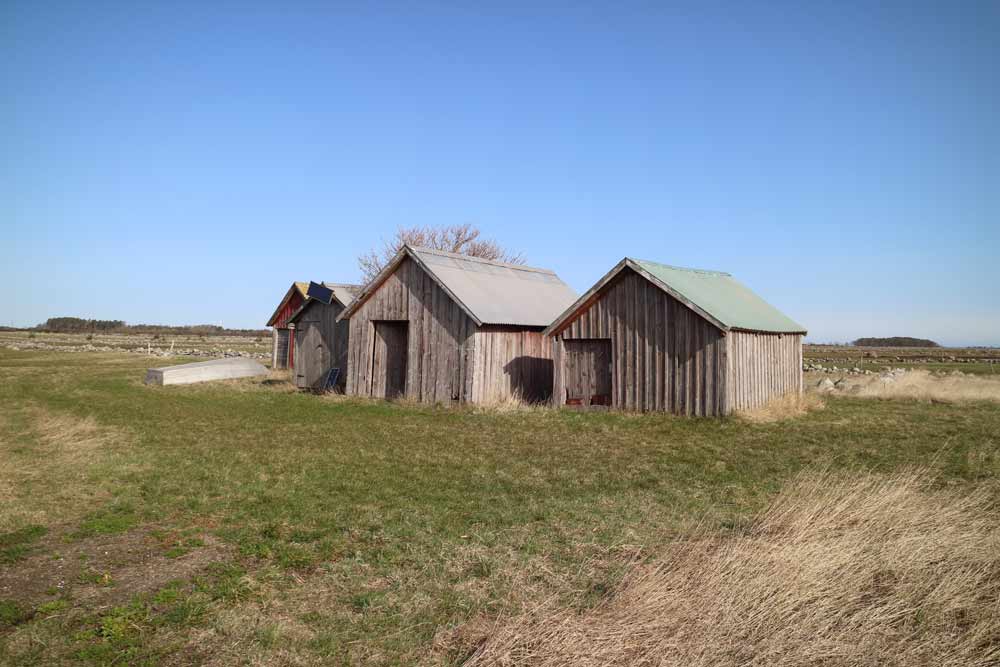 Nere vid kusten ligger byns sjöbodar i ett vackert öppet landskap omgivet av otaliga stenmurar.