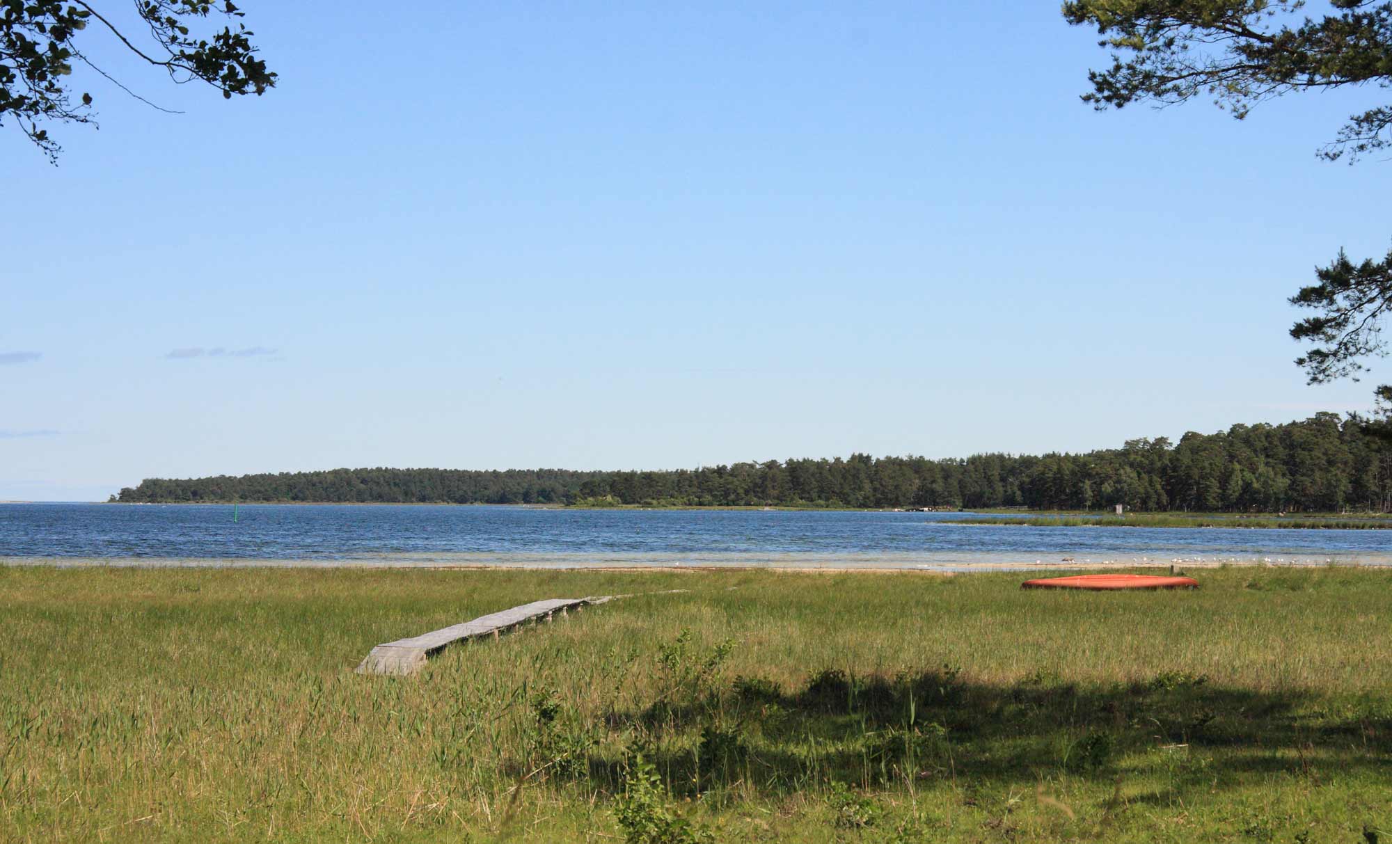 Badplats i Grankullaviken. Sand och gräs.