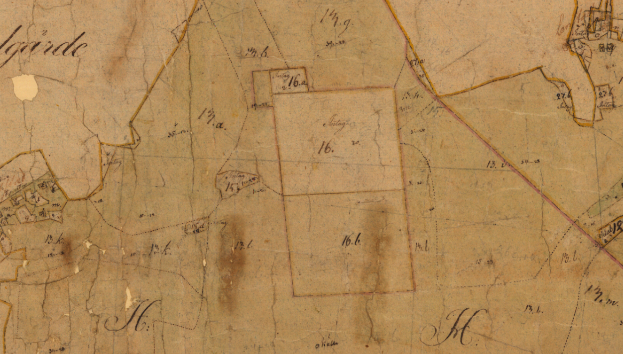 Karta från utmarksdelningen "16. Planterhagen Kalkstad Jute sidländ och något kärraktig av rödaktig alvarjord med getteraktig grund. 16a. Plantörens boställe av örjord på getterbotten en del odlad till åker. 16b. Anslagen utmark till denna lägenhet"