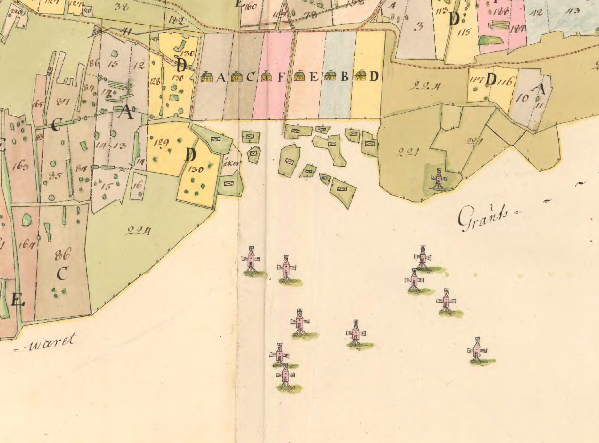 Kalkstad 1793 Lantmäteriets historiska kartor. Obs elva väderkvarnar på alvaret utanför byn. Idag finns inga kvar.