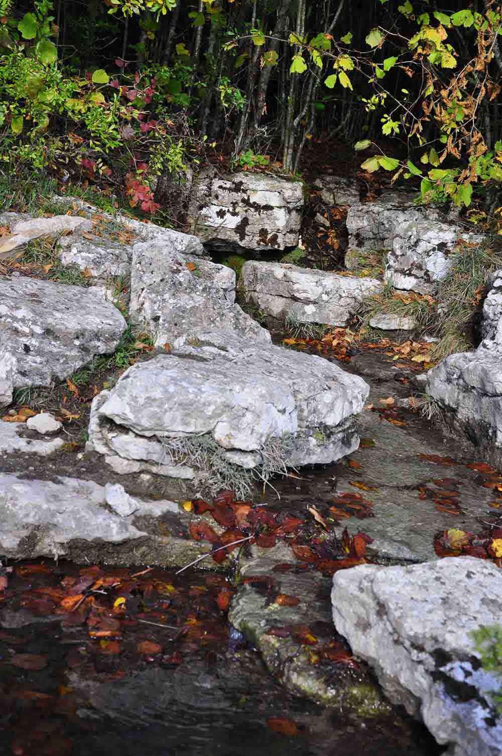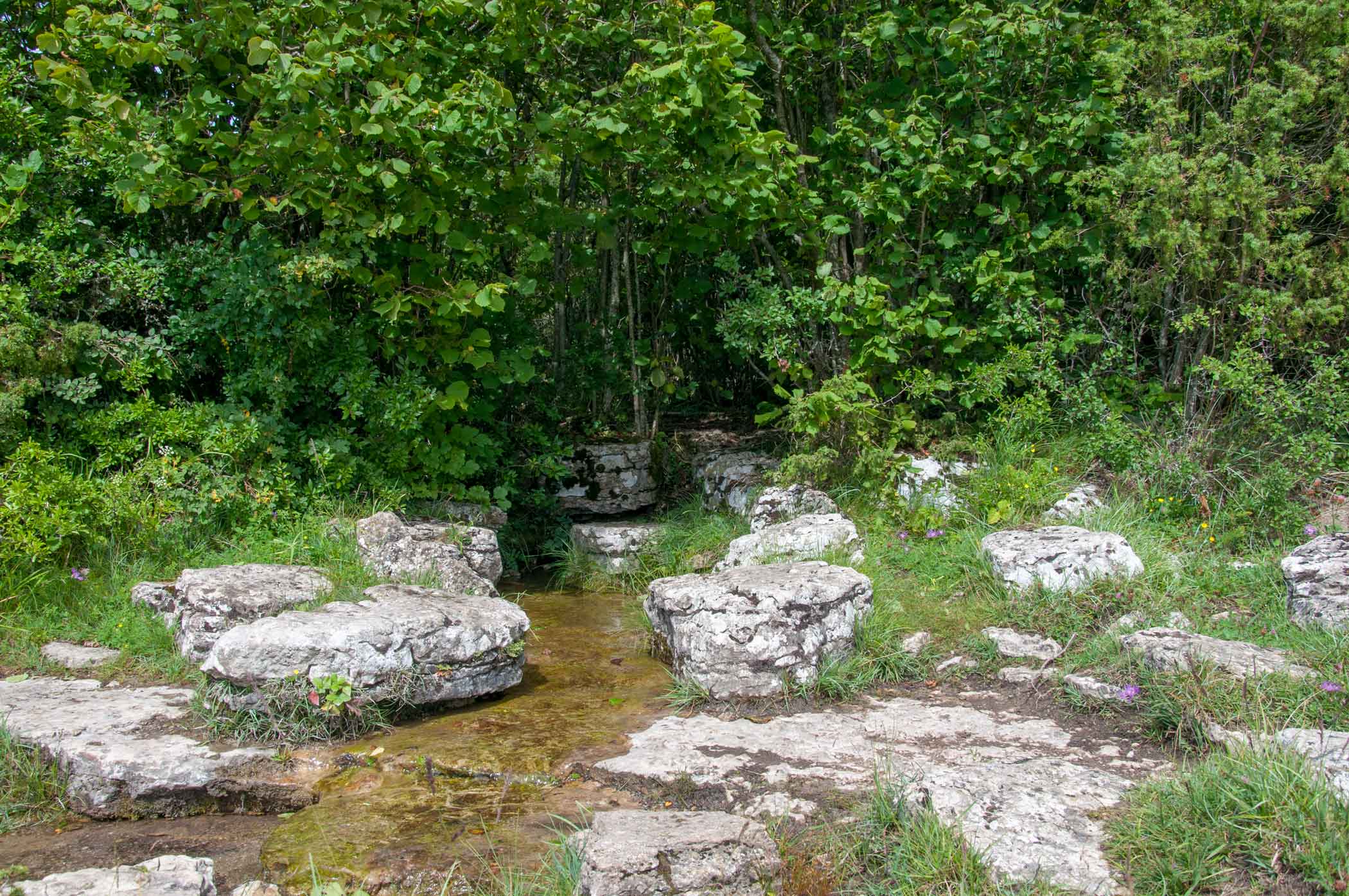 Källflöde som rinner fram ur berget. I våtmarken där källan springer fram finns flugblomster.