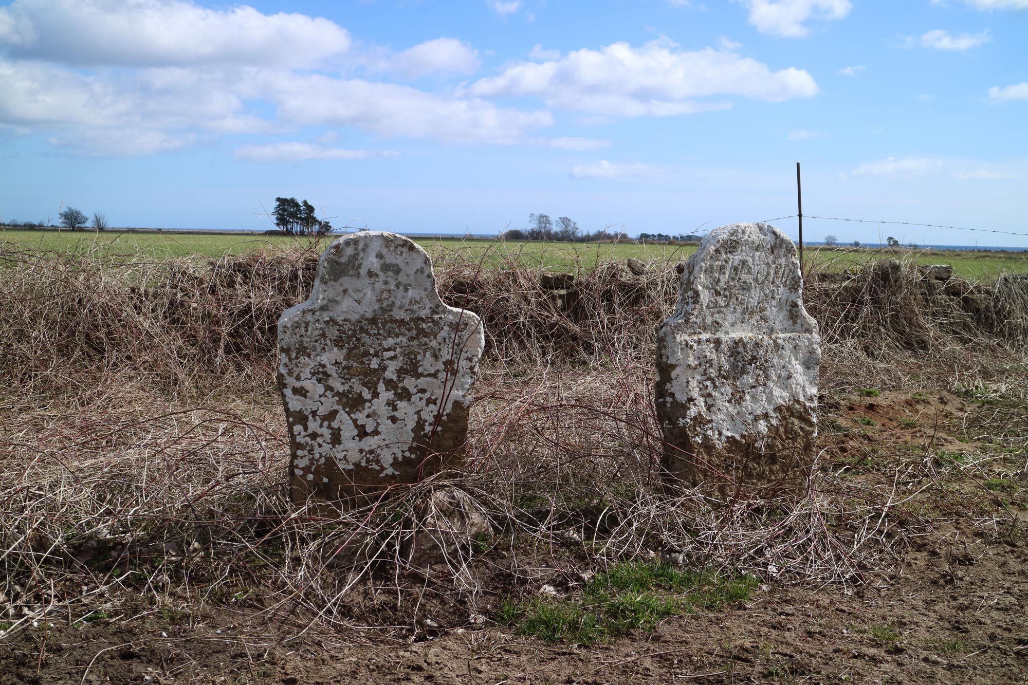 Dessa stenar står bredvid varandra vid den gamla sträckningen av östra landsvägen förbi Södra Sandby. Milstenen står norr om väghållningsstenen. Milstenen har texten 1 MIL.