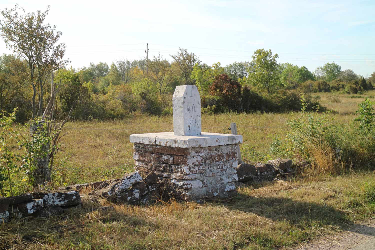 Milstenen står söder om Borgholm vid en parkeringsplats på östra sidan av 136:an (norrgående fordon). Text: " 1 MIL 1866". Parkeringsplatsen är en del av den gamla vägsträckningen.