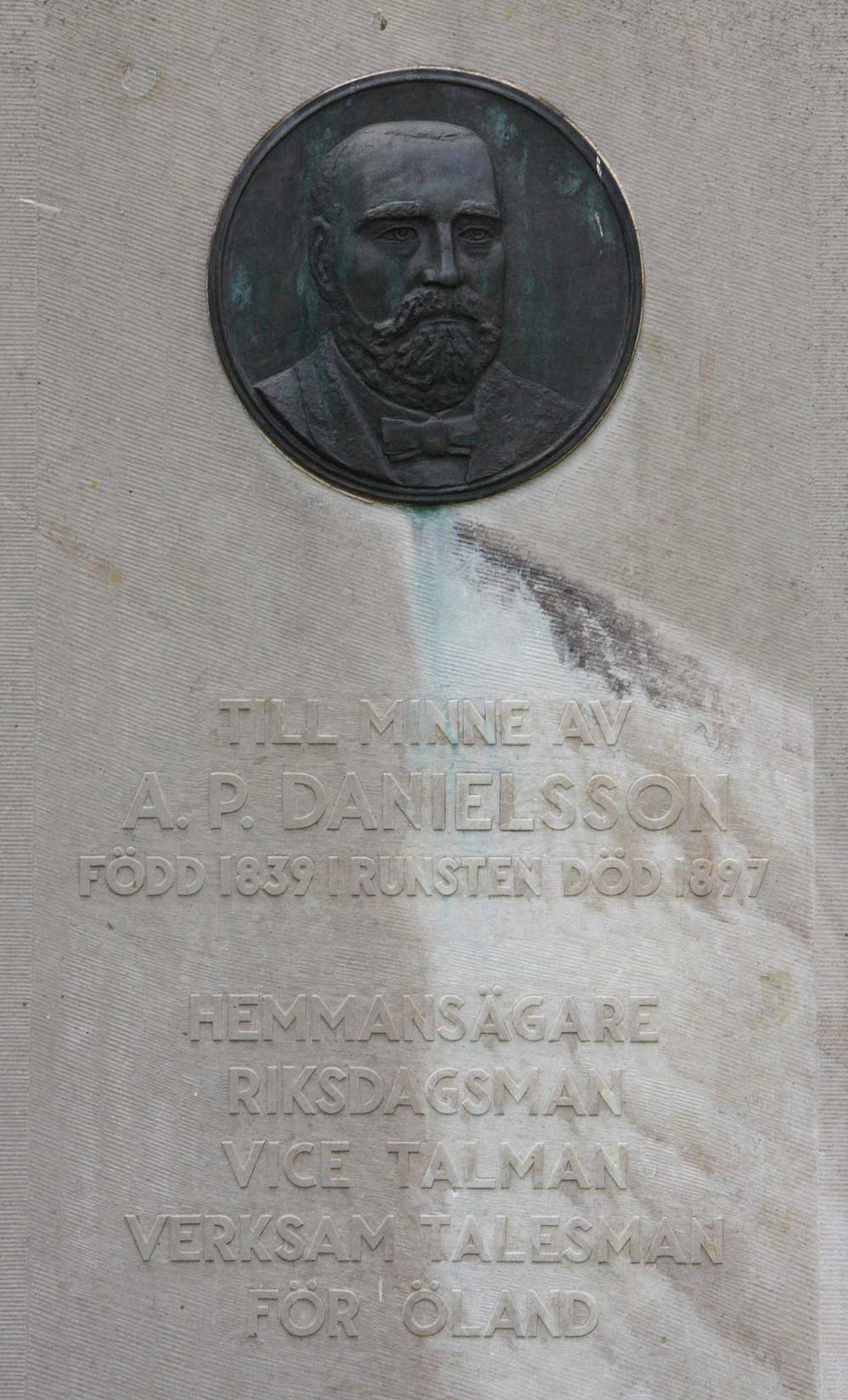 Axel Petter Danielsson (1839-1897) från Dyestad var riksdagsman, ledamot i konstitutionsutskottet och statsutskottet och vice talman. Minnesstenen står framför gamla skolan i Runsten.
