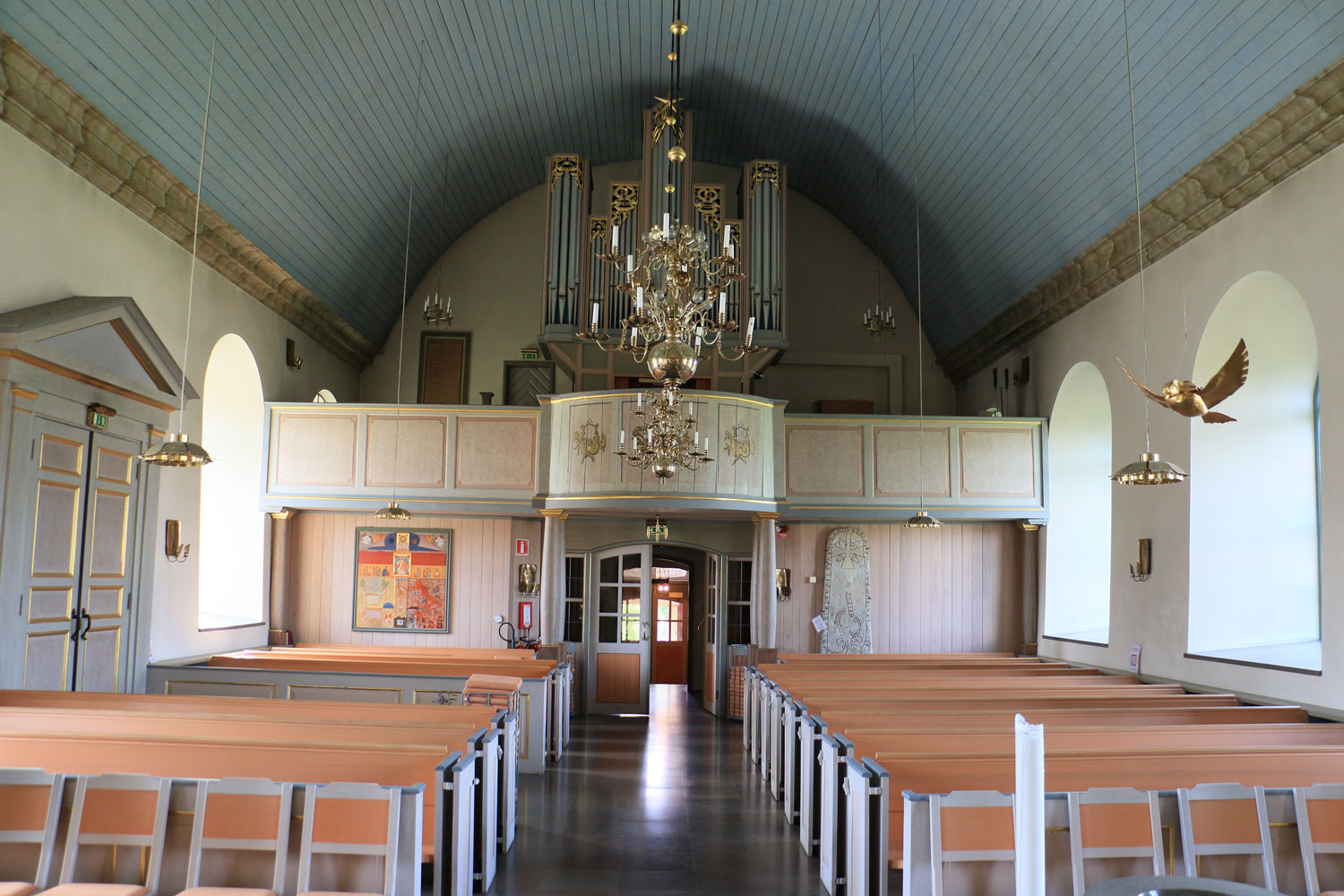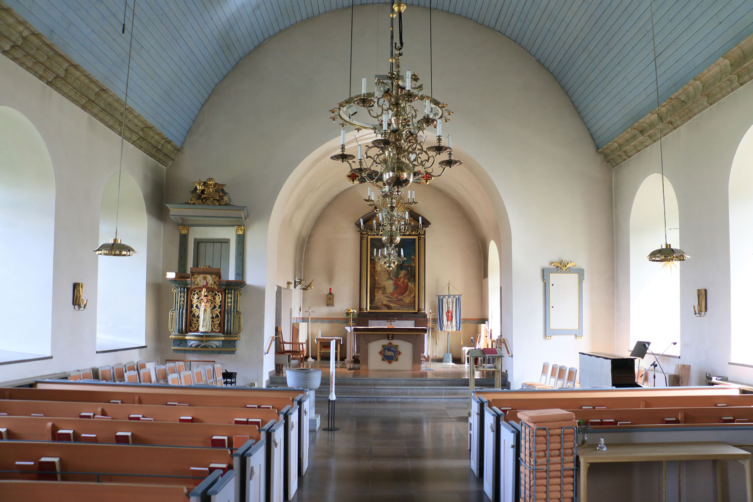 I kyrkan finns en runsten och en dopfunt i öländsk kalksten, vidare ett kyrkskepp samt ett medeltida triumkrucifix och en tavla "Yttersta domen" av Sven-Bertil Svensson. Predikstolen är från mitten av 1700-talet. Orgeln är byggd på 1960-talet av orgelfirman Nils Hammarberg i Göteborg.