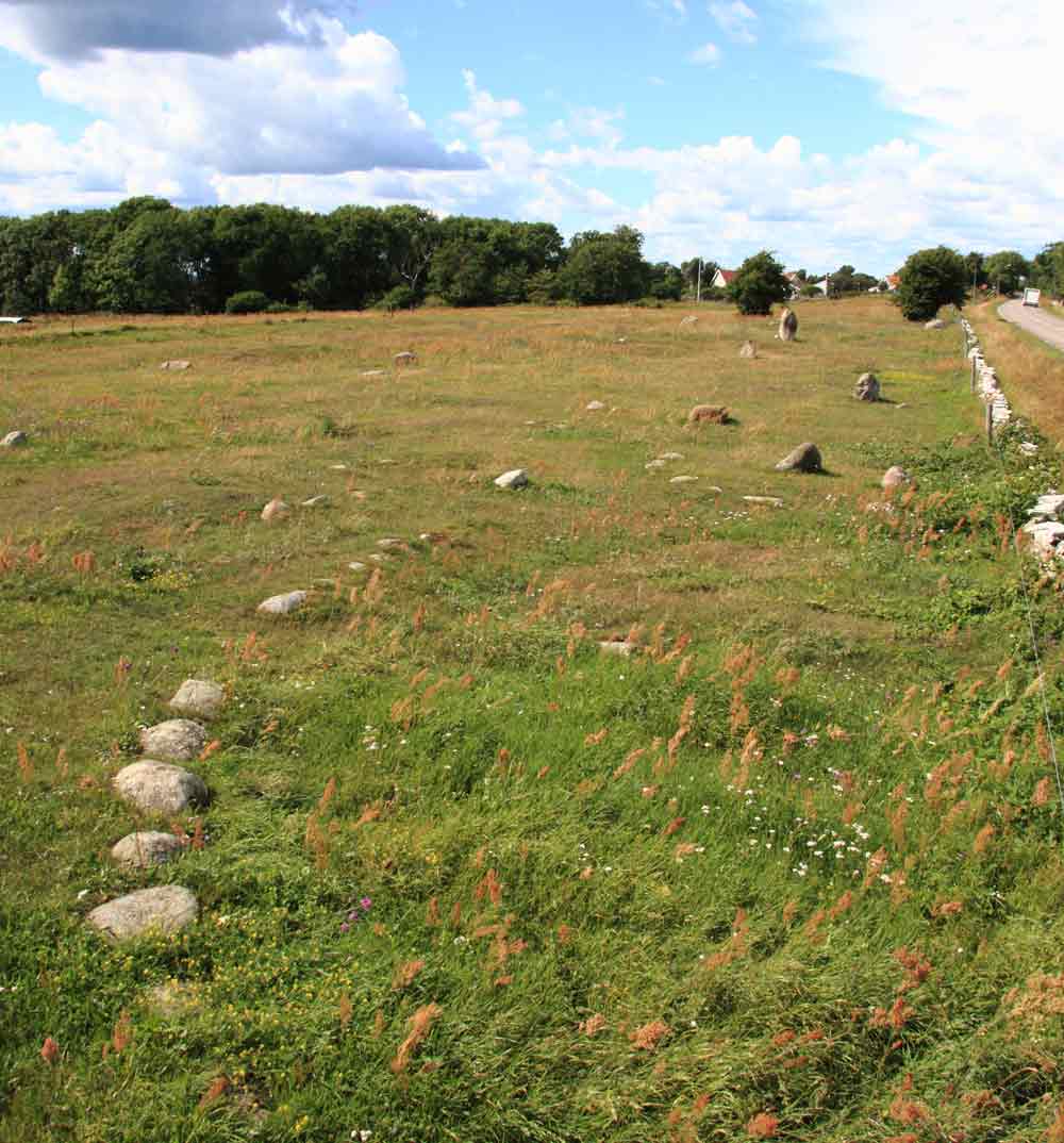 Gravfält från järnåldern som består av cirka 160 gravar. De utgörs av runda och rektangulära stensättningar, högar och fyra treuddar (tresidiga gravar med insvängda sidor). Dessutom finns gravar markerade av resta stenar, klumpstenar och flera kantställda kalkstensflisor. En av flisorna är 3,7 m hög och kallas "Långa Maja".