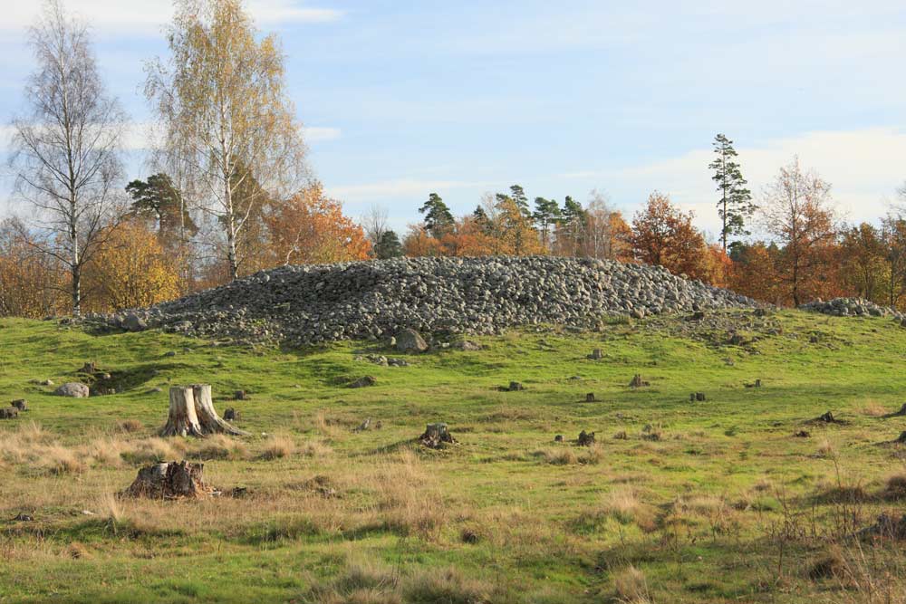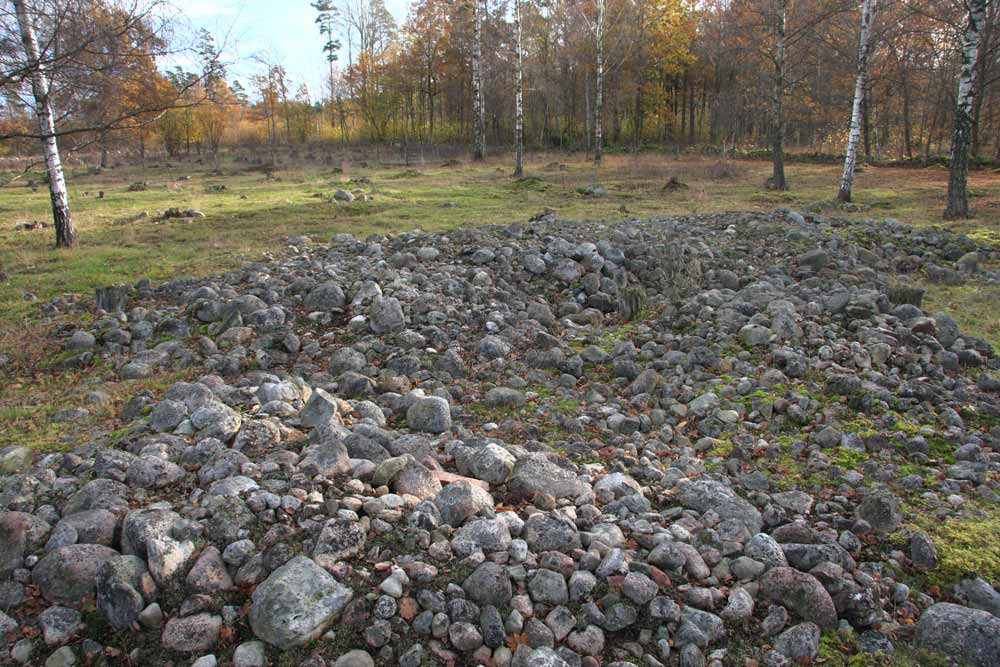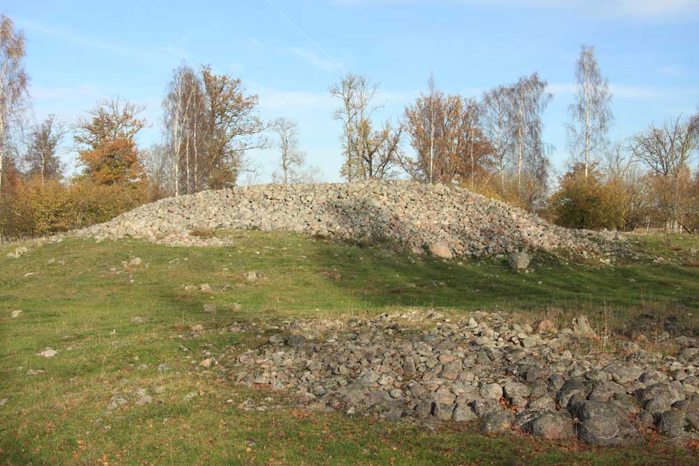 Gravfältet domineras av ett stort röse beläget på en höjd, men består även av 33 runda och en rektangulär stensättning. Många av stensättningarna har mittrösen. Den rektangulära stensättningen har tre meterstora hörnstenar bevarade. Någon undersökning av gravfältet är inte gjord, men torde liksom många gravfält i området runt Skedemosse tillhöra äldre järnålder. Några överodlade huslämningar i åkrarna norr om gravfältet undersöktes 1980 och kunde dateras till romersk järnålder. Flera solidi har hittats på samma åkrar. Rester efter en förstörd skeppsättning kallad Stenstäv, finns intill vägen något söder om gravfältet. Gravfältet är beläget öster om landsvägen Köpingsvik-Gärdslösa. Parkering finns.