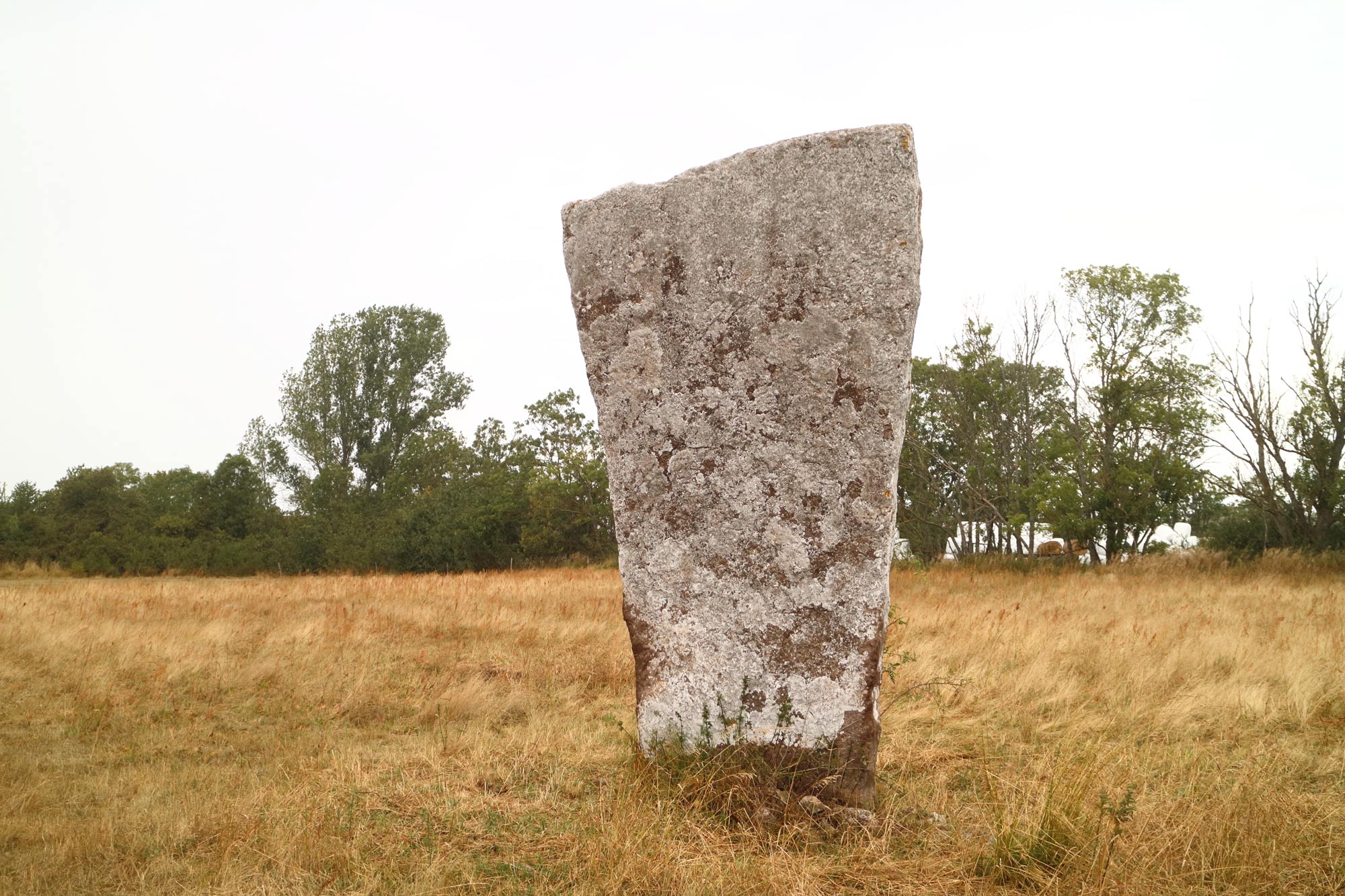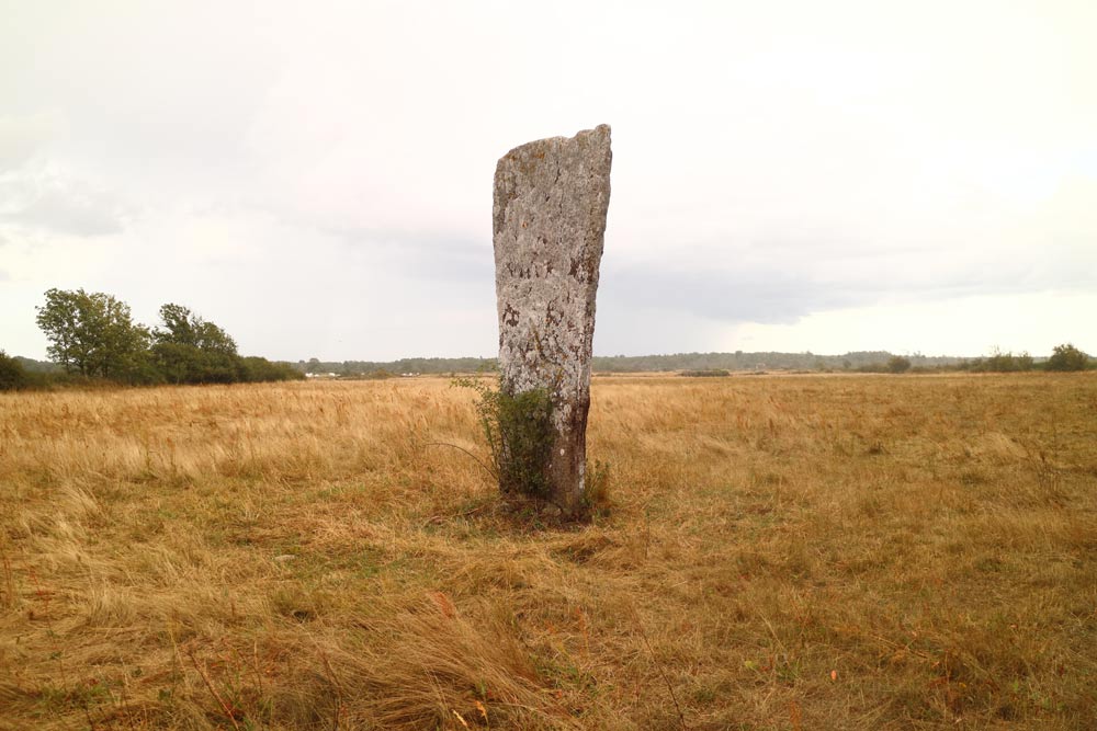 En rest kalkstenshäll av mäktigt format, som står på en grav. Den är 3,75 m hög, 1,7 m bred vid basen, 2,2 m bred i toppen och 0,2 m tjock.