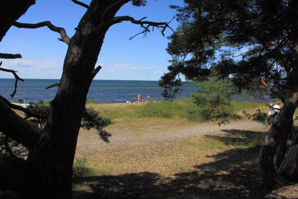 Söder om badplatsen kan man se hur havet äter sig in i branten ner mot havet. Stora träd rasar ner.