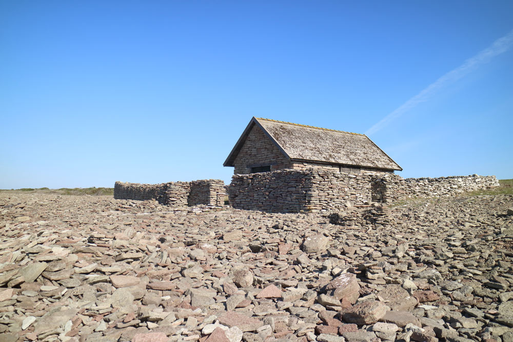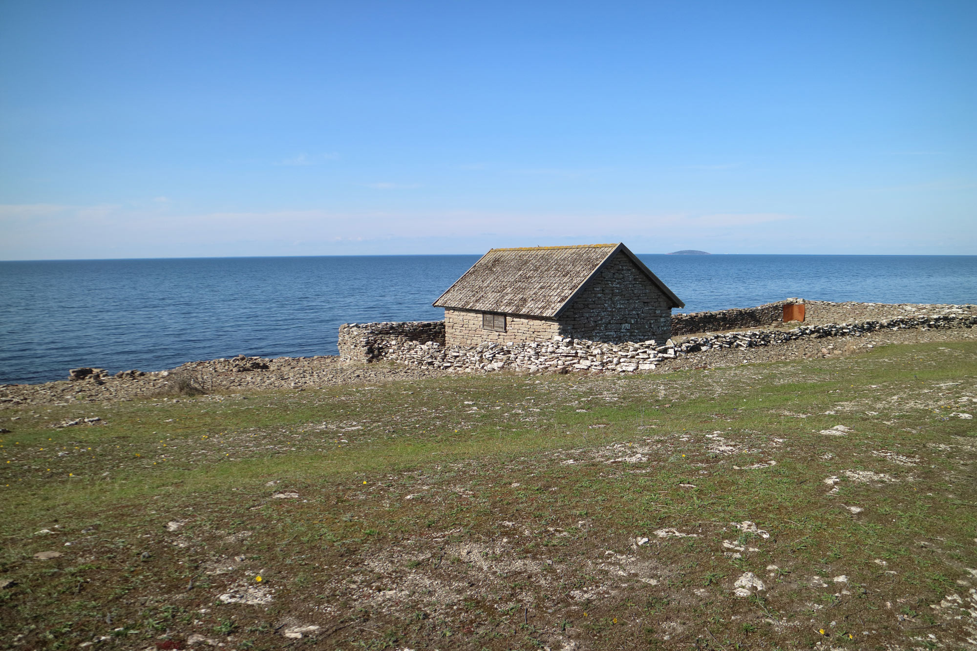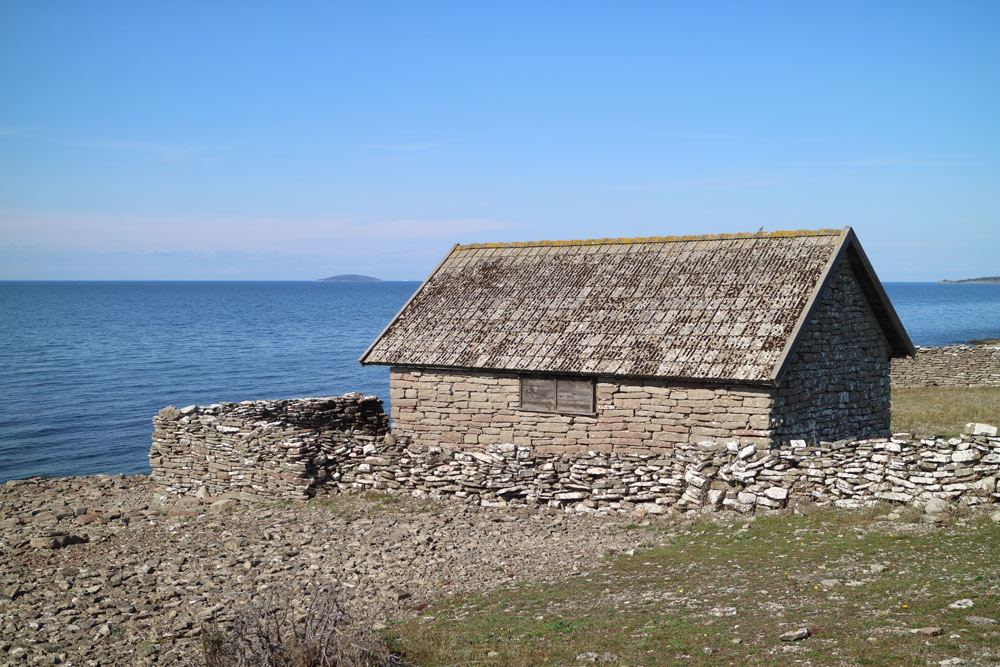 Norväst om Hagelstad ligger denna sjöbod i sten ensam. I bakgrunden kan man se Blå Jungfrun. Sjöboden ligger vid Kustvägen Sandvik-Byrum.