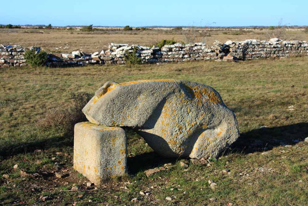 Skulpturen OXE av Anders Lundgren, Mörbylånga, en av de tre skulpturerna på Skulpturleden på den gamla banvallen efter f d Ölands järnväg. Parkera vid parkeringsplatsen vid gamla stationen i Skärlöv och gå banvallen söderut.