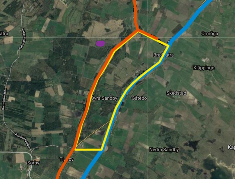 Gul linje = Forntida hästkapplöpningsbana på strandvallarna Rött = Ancylusvallen Blått = Littorinavallen