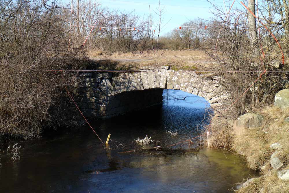 En liten stenvalvsbro väster om Åkerby vid en mindre väg. Vattendraget som bron leder över är den nordliga grenen som kommer från Högsmossen och Grindmossen och som sedan tillsammans med övriga vattendrag rinner under Pelna bro.