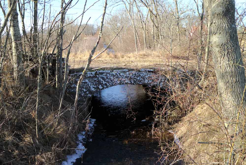 En liten stenvalvsbro vid en brukningsväg över ett litet vattendrag som kommer från Dyestads mosse. Bron ligger nära Tornlundens hembygdsgård.