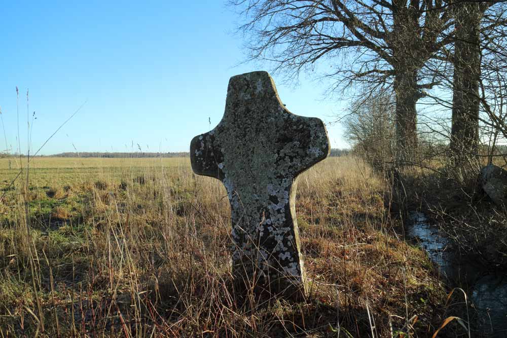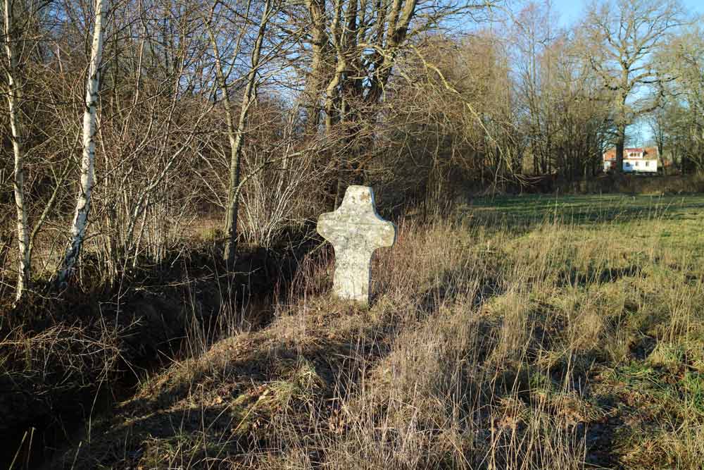 Detta medeltida stenkors av röd kalksten är 1,5 meter högt och står vid en åkerkant 200 m öster om landsvägen i Tjusby några meter norr om en markväg ner mot havet. På korsets västra sida finns uthugget en sexuddig stjärna i en i cirkel. Liknande stjärnor finns i södra korsarmens valv i Gärdslösa kyrka. På korsets östra sida finns inristat ett ringkors med viggmönster. Korset är ett minneskors. Enligt en sägen skulle en präst ha ridit ner sig eller kört ihjäl sig här under snöyra en julotta.