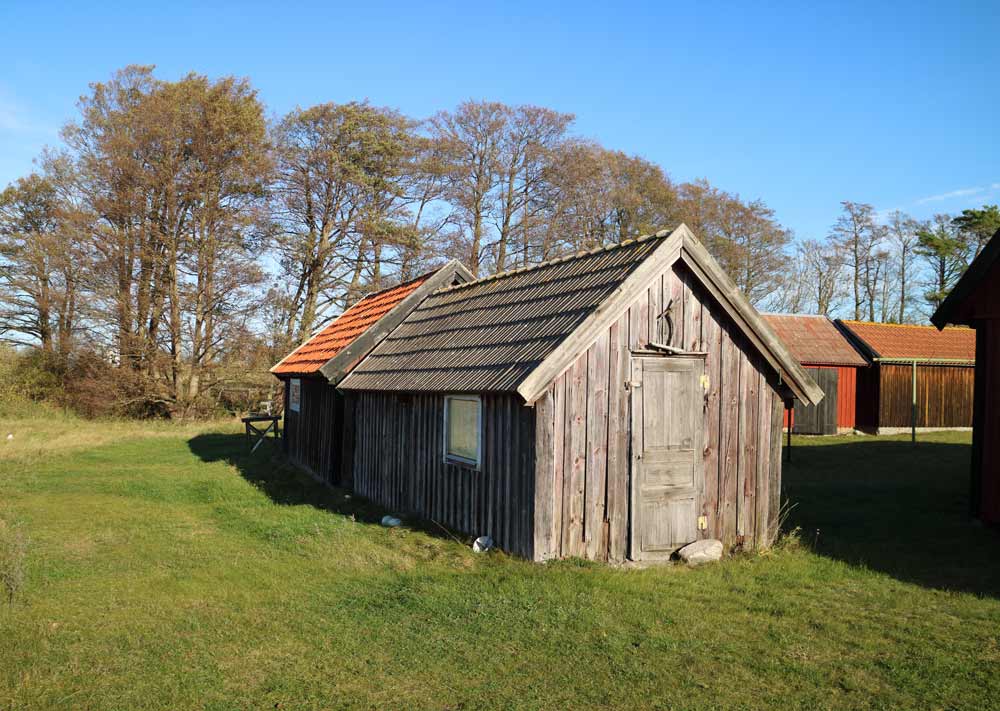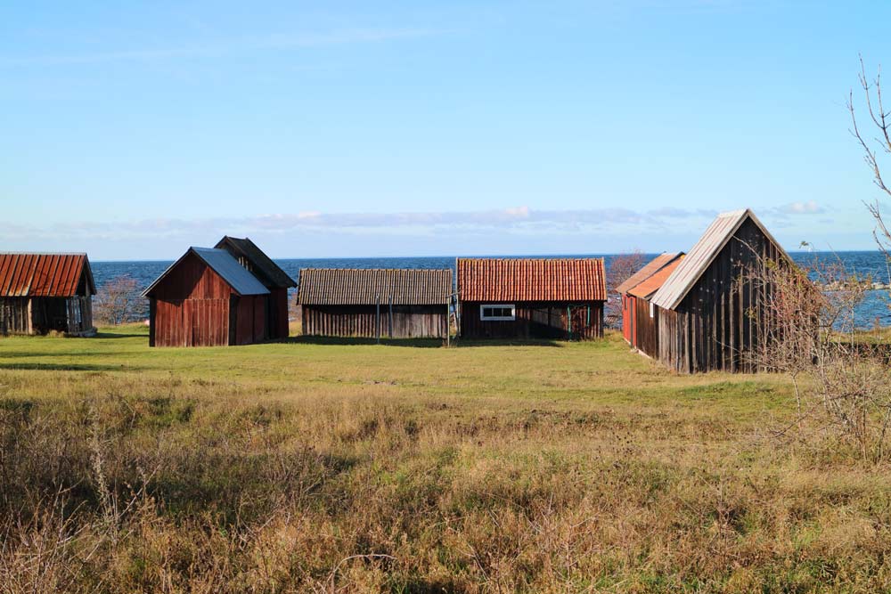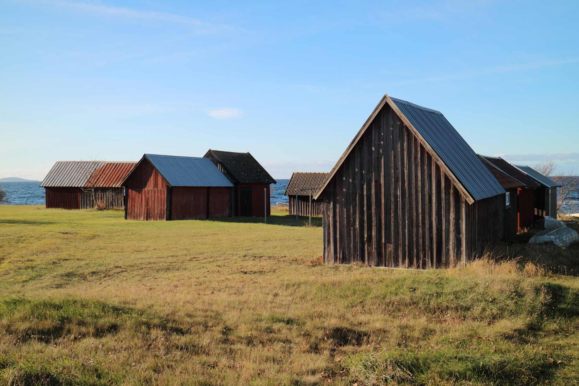 Sjöbodar i trä strax söder om Tokenäs udde.