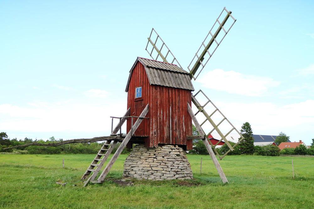 En av Persnäs hembygdsförenings väderkvarnar. Den har stenfot som så många andra kvarnar på norra Öland.