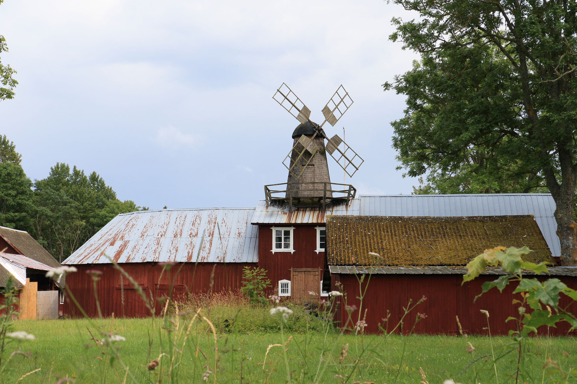 Den här väderkvarnen står på ett ladtak i Högby-Vedby.