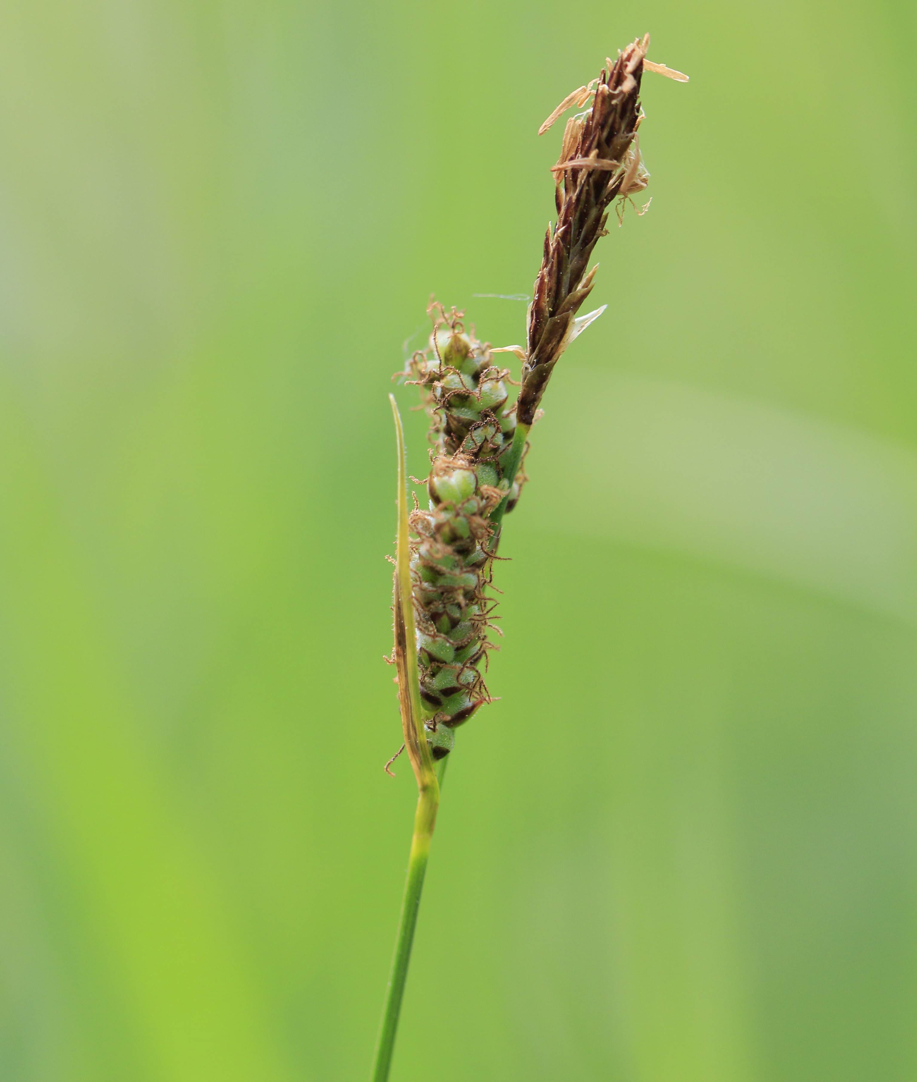 Axsamlingen består av ett ensamt hanax och ett eller två, kort elliptiska honax, stödbladet är ganska kort. Axfjällen är mörkbruna med grön mittnerv och fruktgömmena är klotrunda och tätt filtludna. Honblommorna har trekantig nöt.