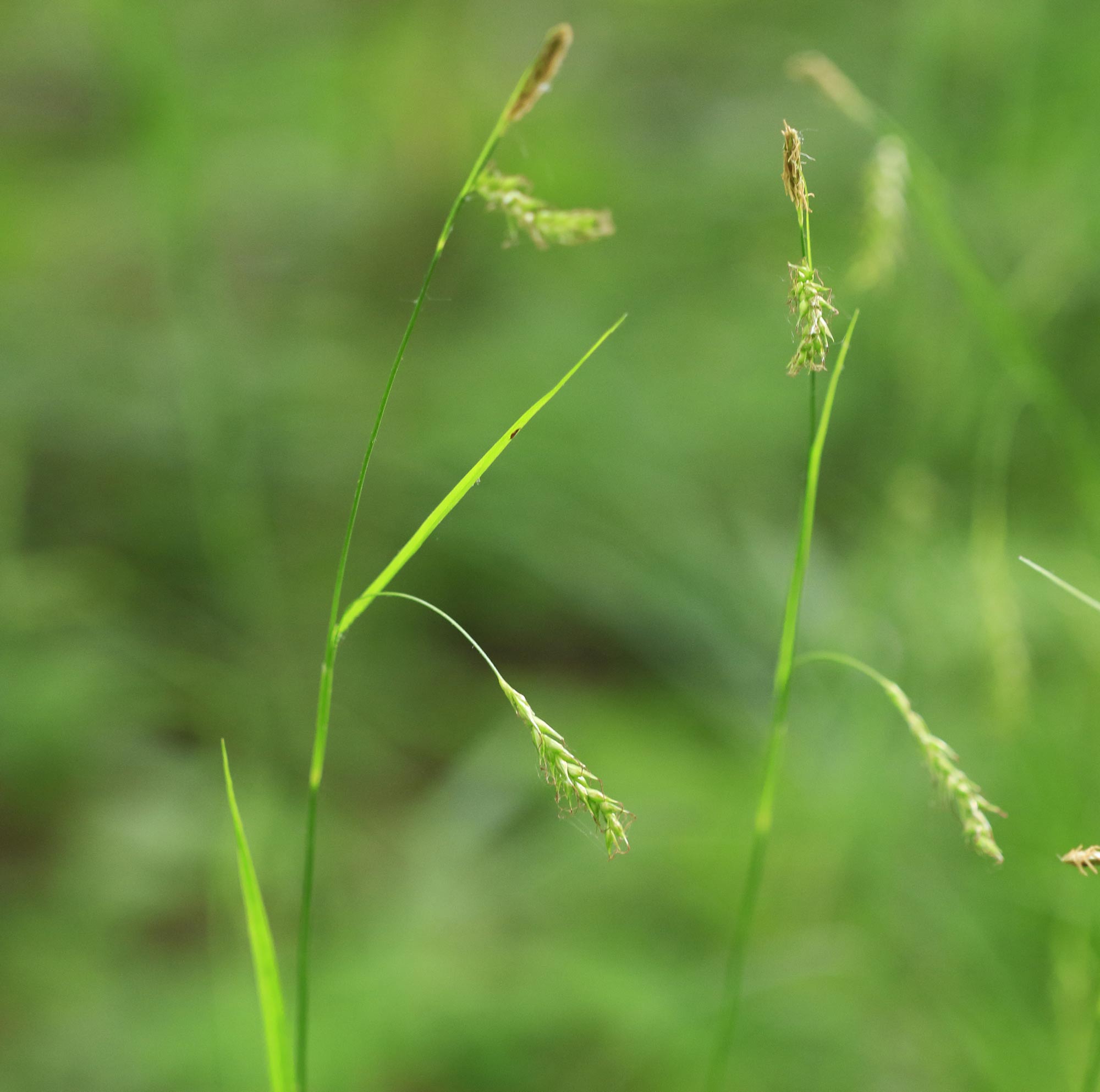 Skogsstarr är lätt att känna igen på de breda, slaka bladen och de långsmala, glest sittande honaxen som hänger på tunna axskaft.