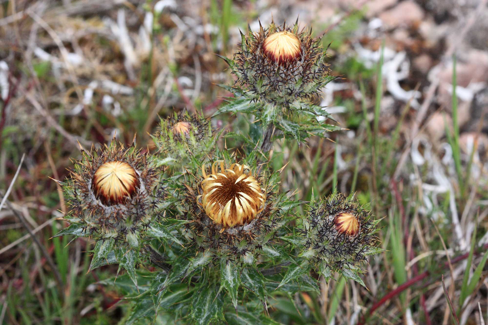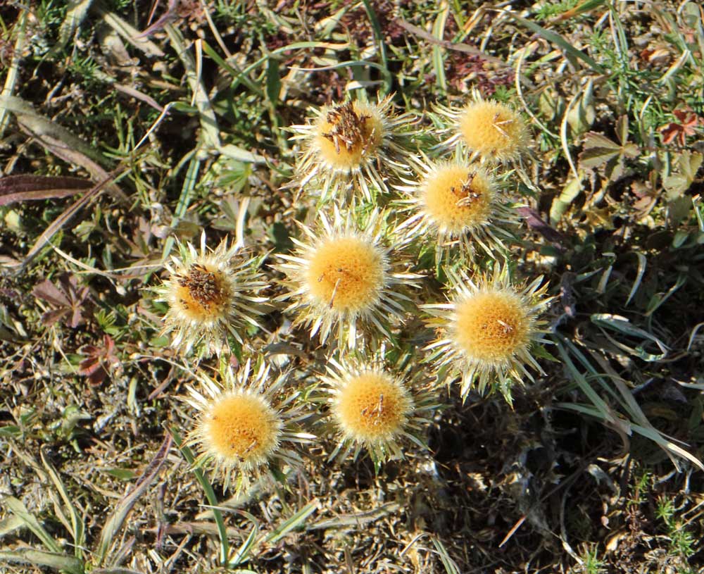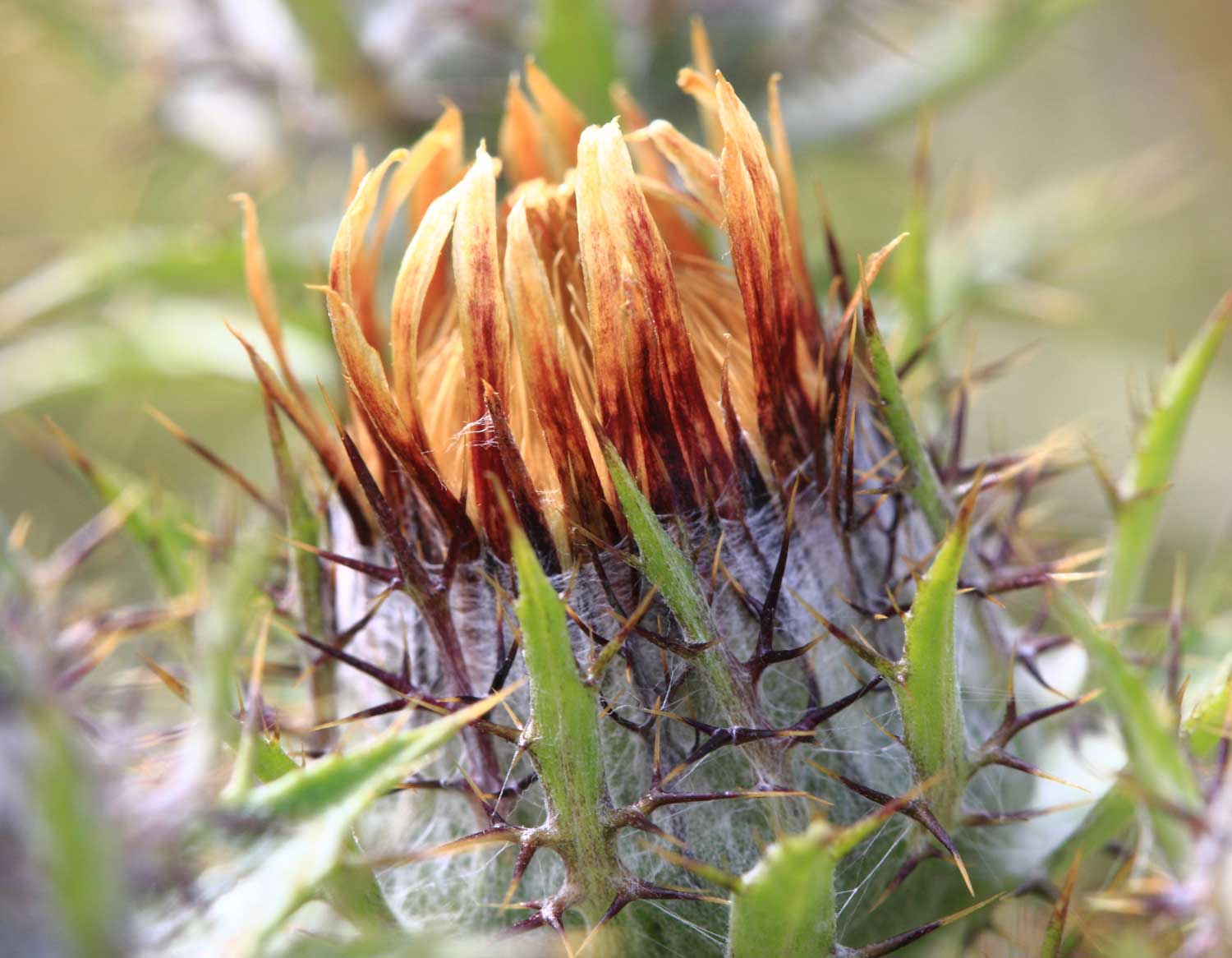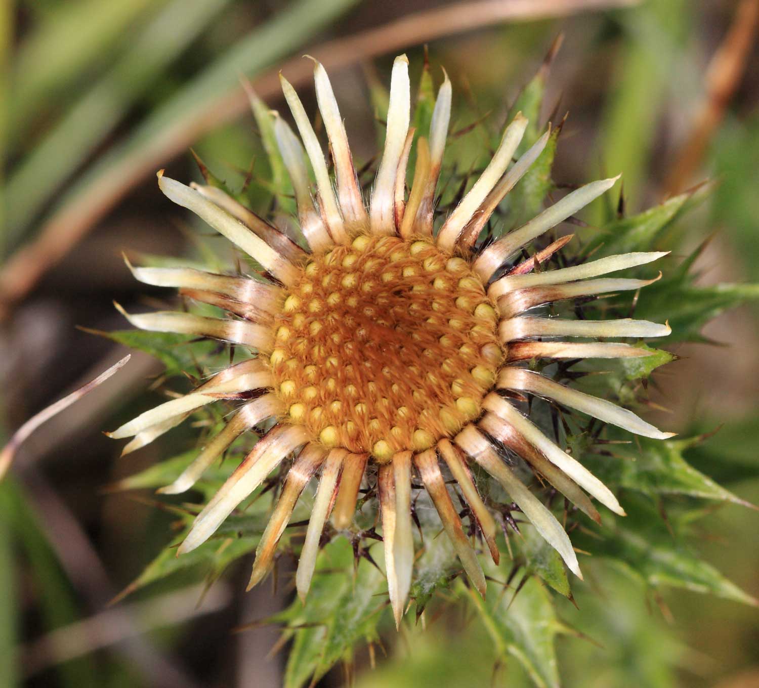 Spåtistel blommar i juli-augusti. Blomkorgarna är klotrunda och har tegellagda holkfjäll som är tandade i kanten, de yttre holkfjällen är örtartade, medan de inre är hinnlika, långa och smala. Blommorna är tvåkönade, rörlika, gula med röda eller sällan vita spetsar. Korgarna är bara utslagna i solig väderlek.