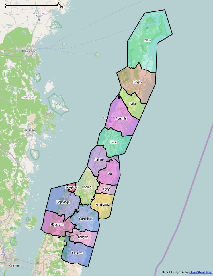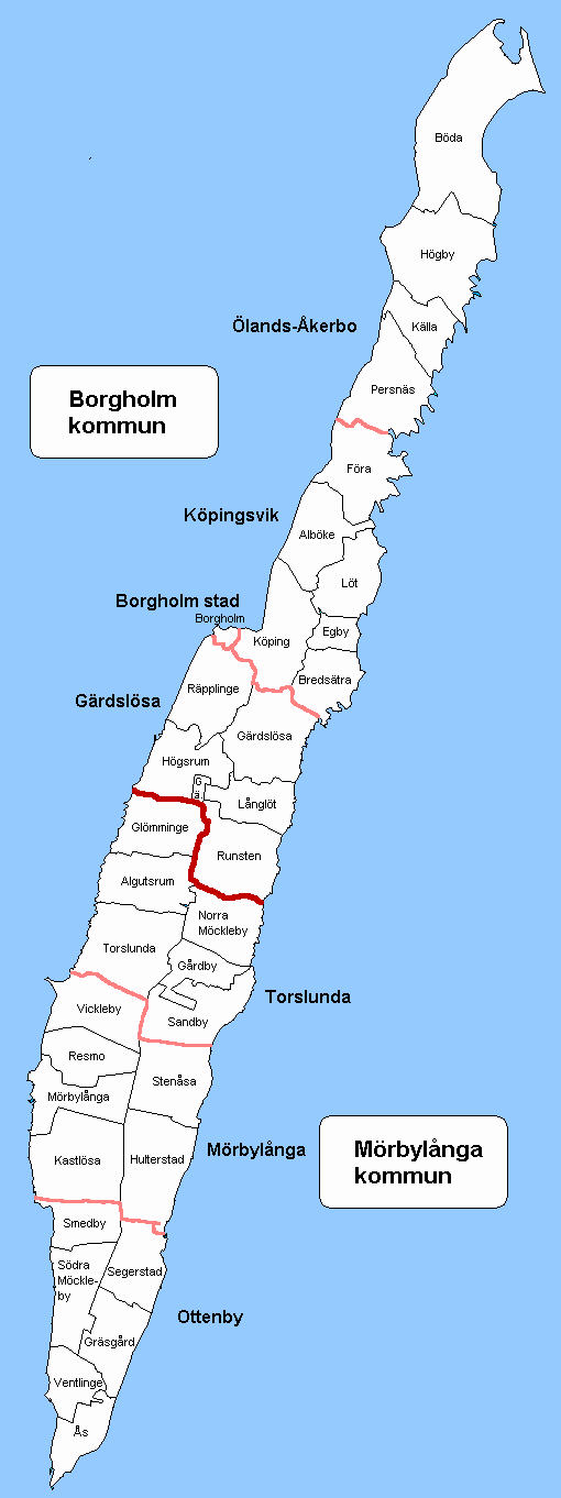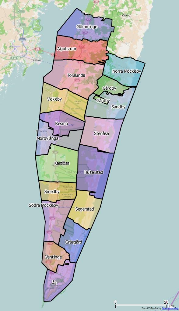 Öland har 33 socknar och en stad, Borgholm.