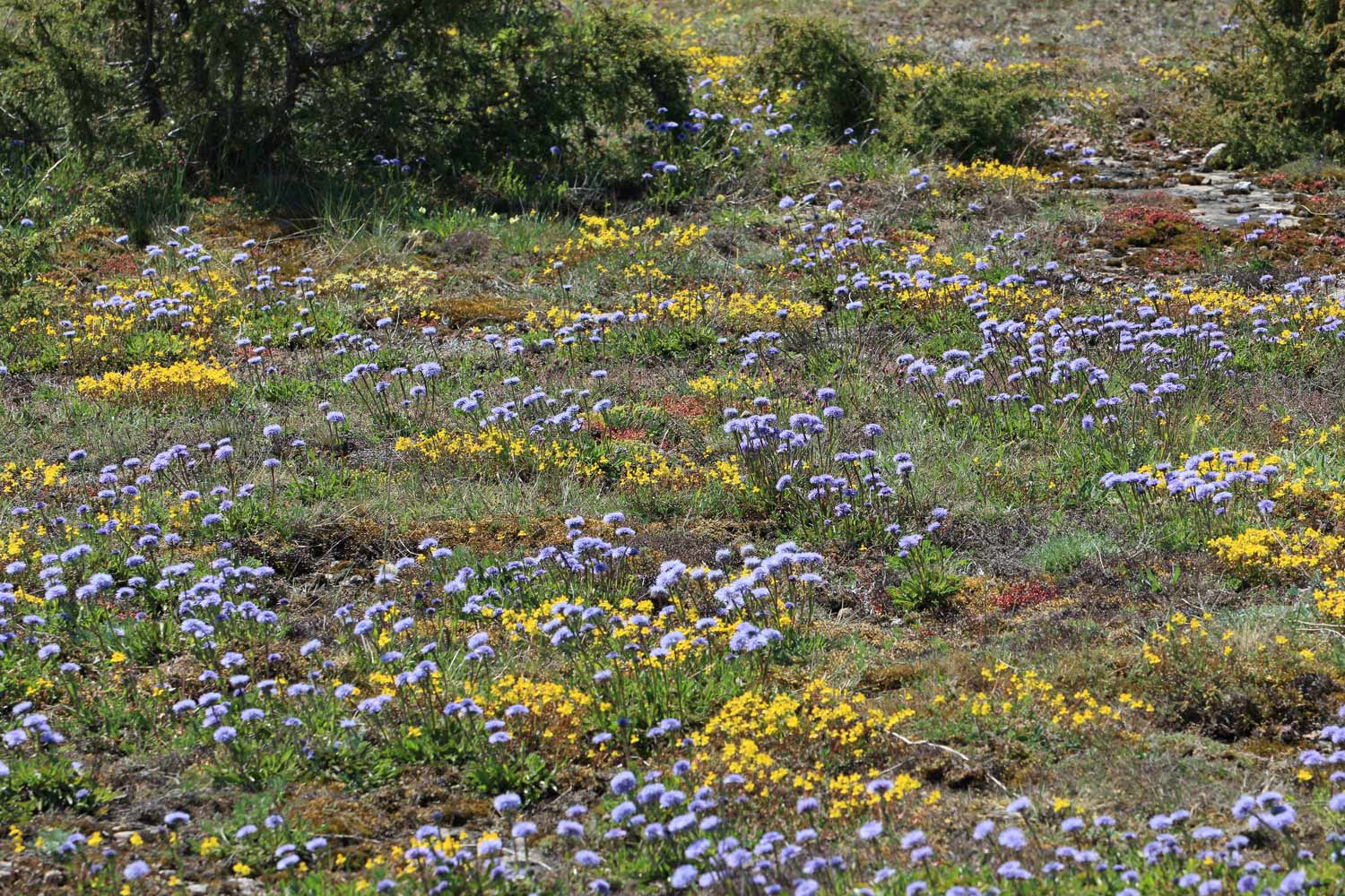 Så här såg det ut igår 31 maj vid Möckelmossen. På alvarets tunnaste jordar har ölandssolvändan börjat blomma. Den har fått sällskap av bergskrabban. Tillsammans ger de ett blågult landskap.