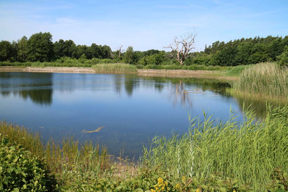 I den här bevattningsdammen häckar gråhakedopping, sothöna och änder. I vassar och buskage kring dammen kan man höra rörsångare och kärrsångare sjunga.