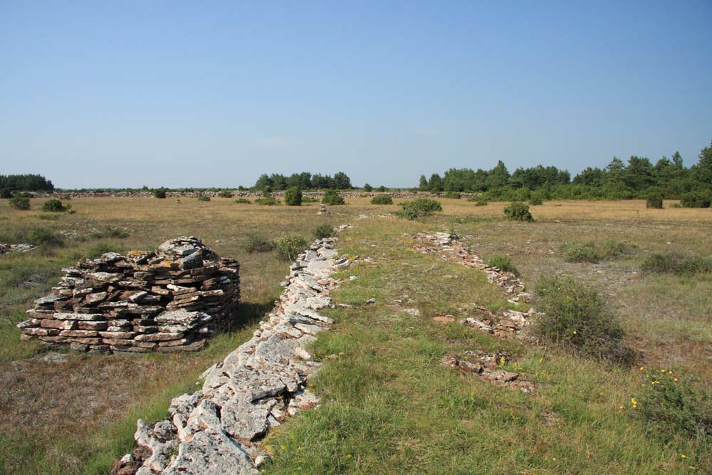 Vid sidan om vallen finns två kvadratiska stenbyggnader uppförda av 0,2-1 m kalkstenshällar i kallmur. Enligt uppgift är stenbyggnaderna kvarlämnade varulager av kalkstenshällar s k "palmar" upplagda på detta sätt.