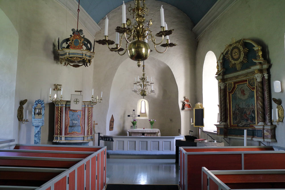 Längst in i kyrkan finns absiden med det smala medeltidsfönstret och altarbordet. Detta har funnits kvar i mer än 800 år.