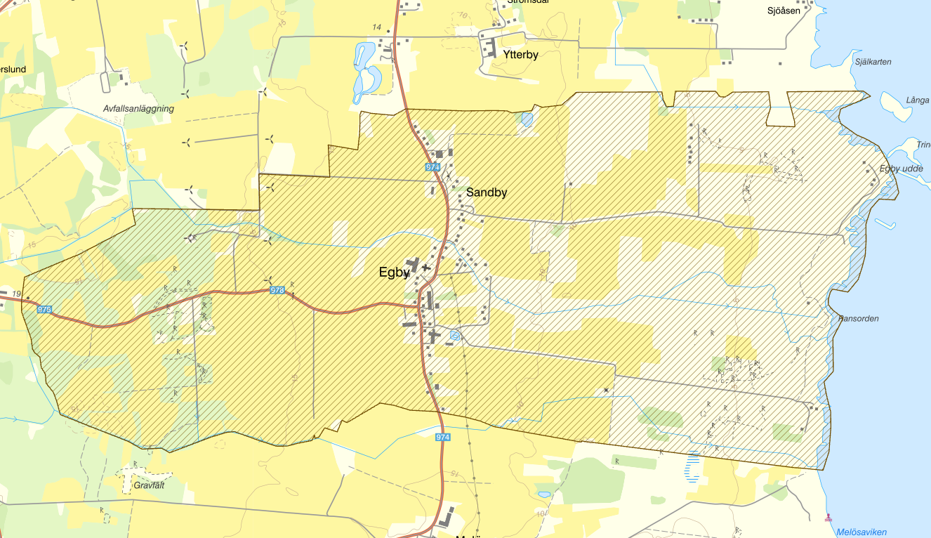 Mellan Egby och Sandby ligger den gemensamma malmen, med delvis välbevarad bebyggelse och mycket välskötta stenmurar. Till de båda byarna hör sjögator och ett antal sjöbodar. Odlingslandskapet är öppet och har ett mycket tydligt och välbevarat skifteslandskap där de långsmala ägorna delas in av stenmurar.