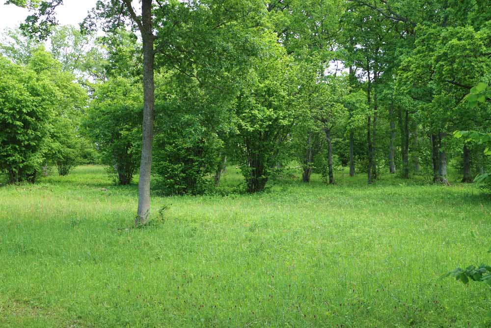 Ek, ask och hassel dominerar de trädbevuxna delarna av ängen. Ekarna är gamla och vidkroniga. En del av askarna bär spår av hamling. Många hasselbuskar är högvuxna och mycket gamla. Här finns lundslok, liljekonvalj, hässlebrodd och lundgröe.