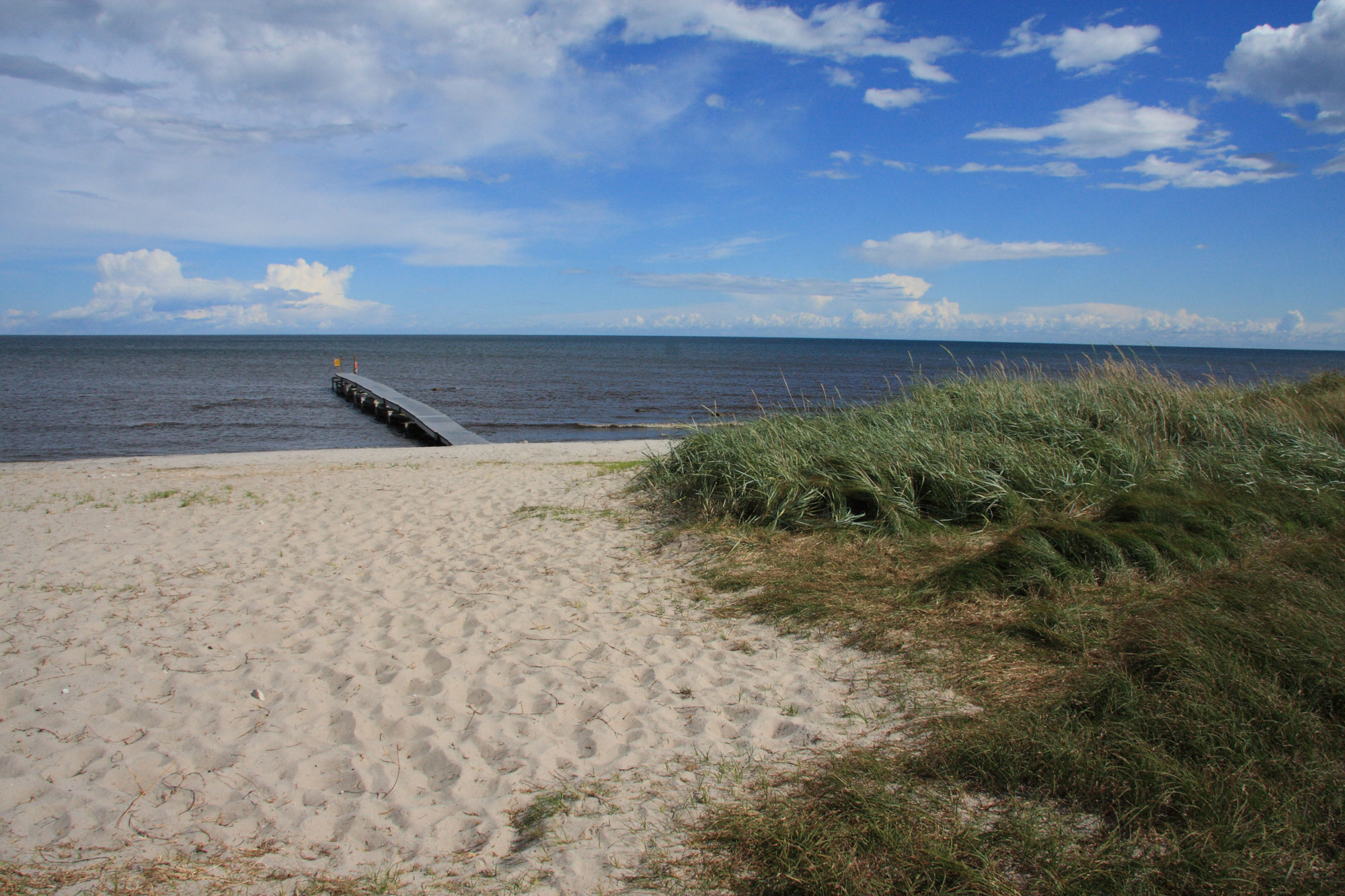 Kommunal badplats med badbrygga, toalett, sandstrand o gräs.