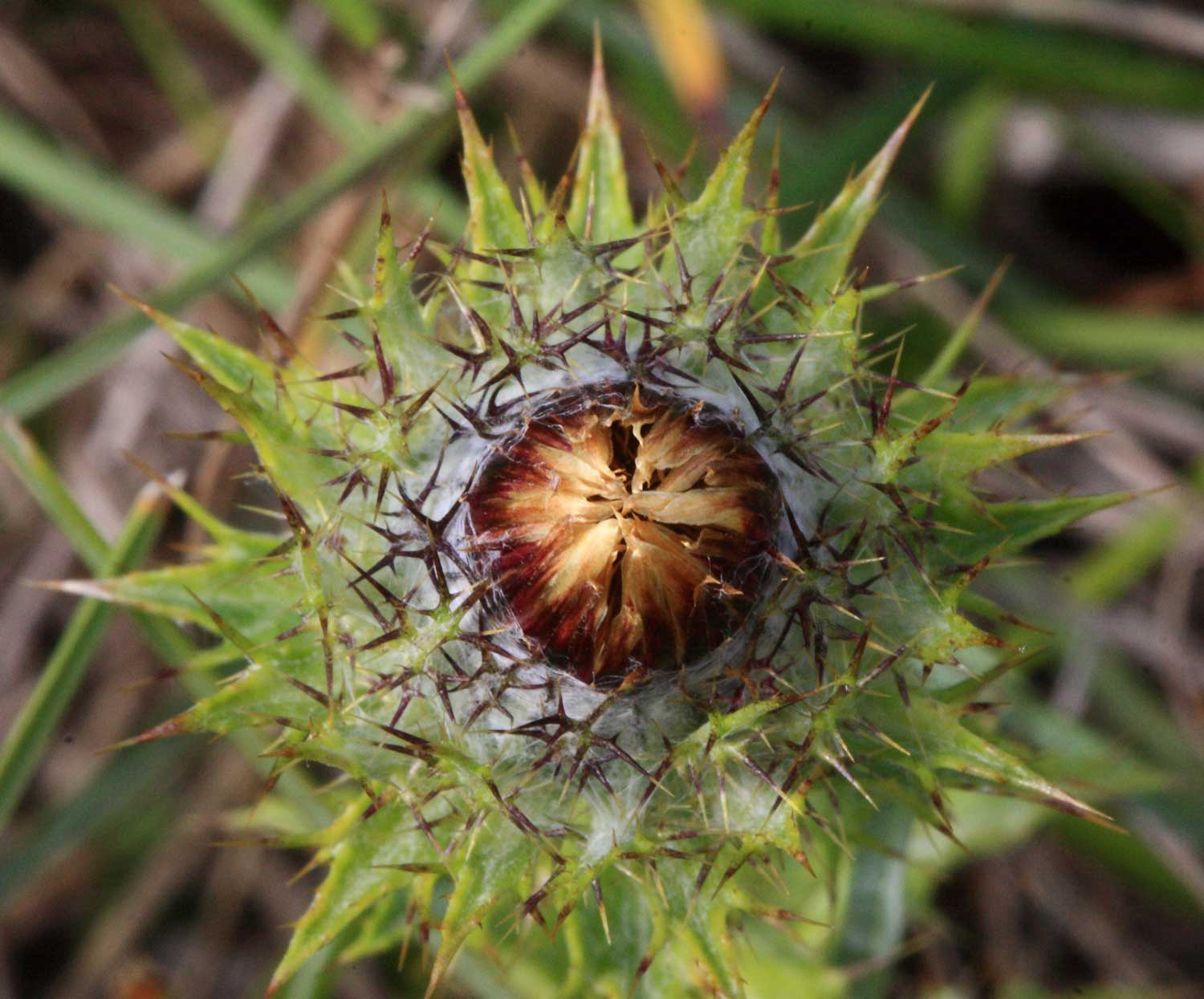 Spåtistel blommar i juli-augusti. Blomkorgarna är klotrunda och har tegellagda holkfjäll som är tandade i kanten, de yttre holkfjällen är örtartade, medan de inre är hinnlika, långa och smala. Blommorna är tvåkönade, rörlika, gula med röda eller sällan vita spetsar. Korgarna är bara utslagna i solig väderlek.