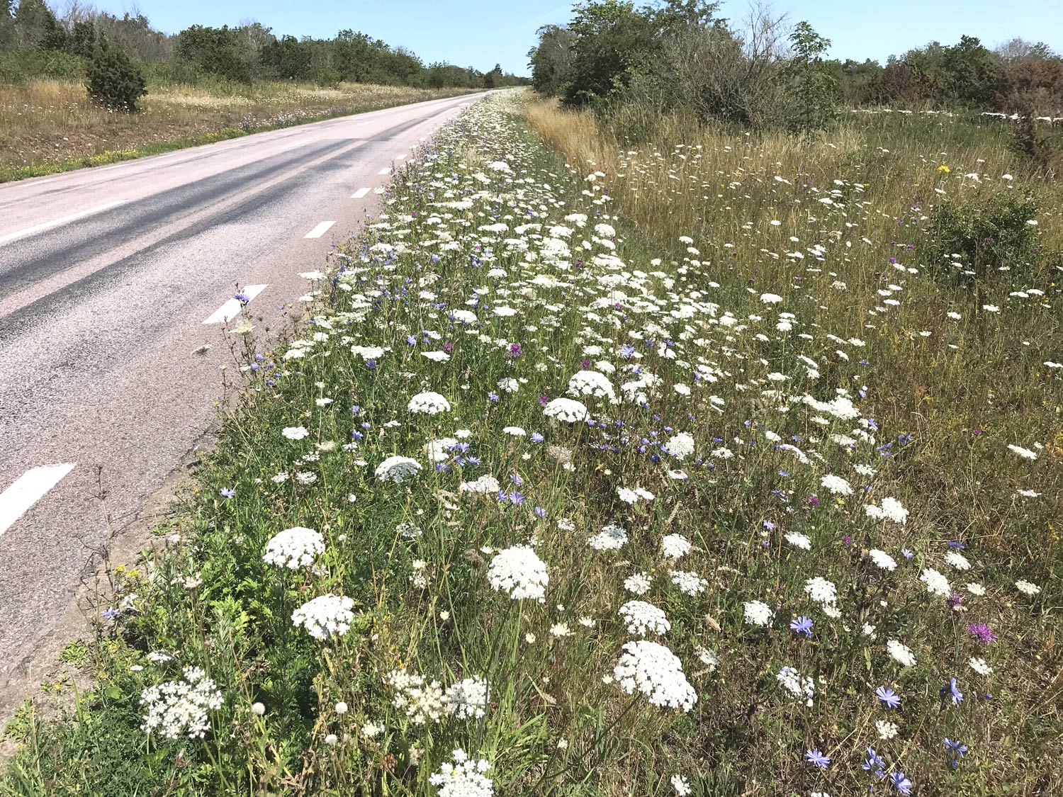 Vildmorot (vit flock, ser ut som hundkex) finns också i stora mängder i mitten av juli.