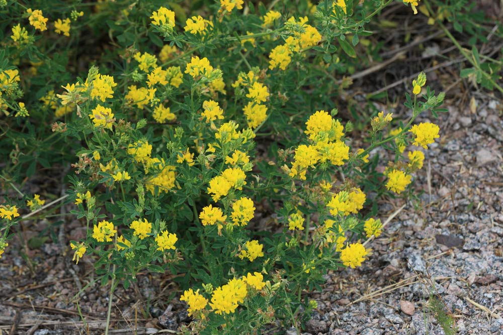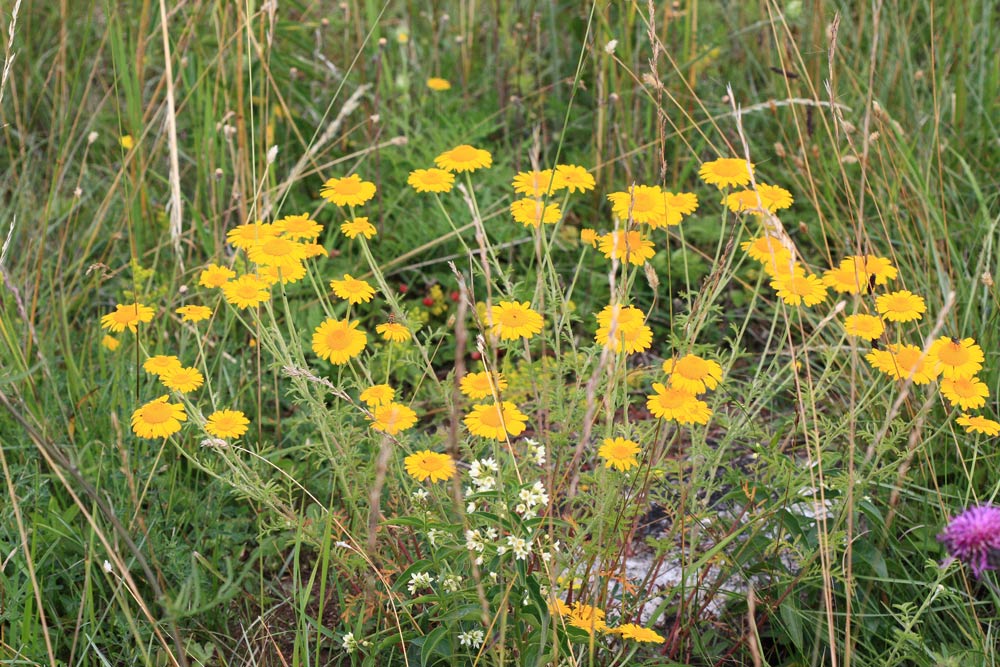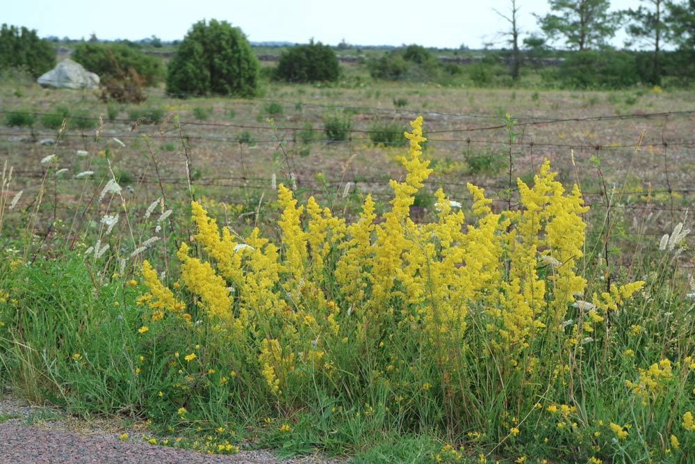De gula blommorna domineras av gulmåra, gullusern och färgkulla. Även gul sötväppling, stånds och renfana fnns här och där. Stånds är en högrest, korgblommig växt som står lite för sig själv. Renfana blommar som mest lite senare i juli. Den är också en korgblommig växt men som bara har en samling gula knappar som blommor.