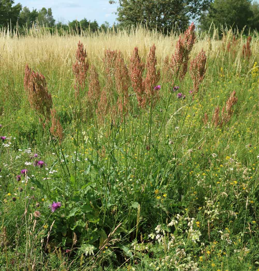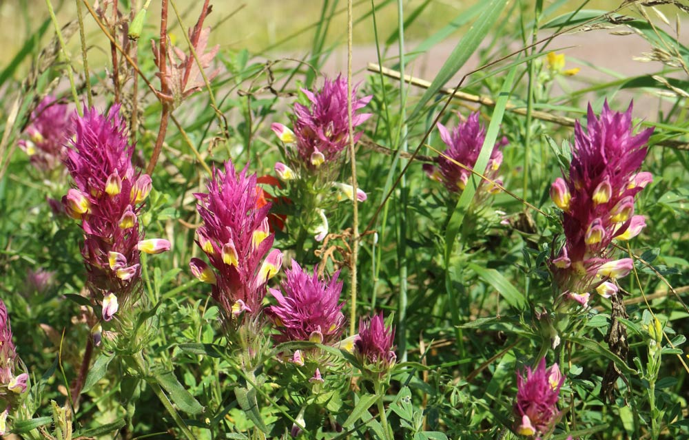 En växt som lyser klart rött på lite håll i gräset är pukvete, som kan ses på flera platser längs östra landsvägen genom Gårdby och Sandby.