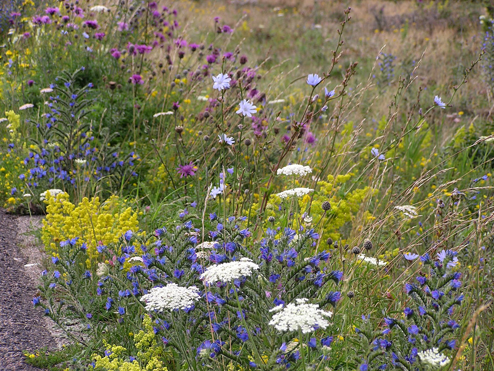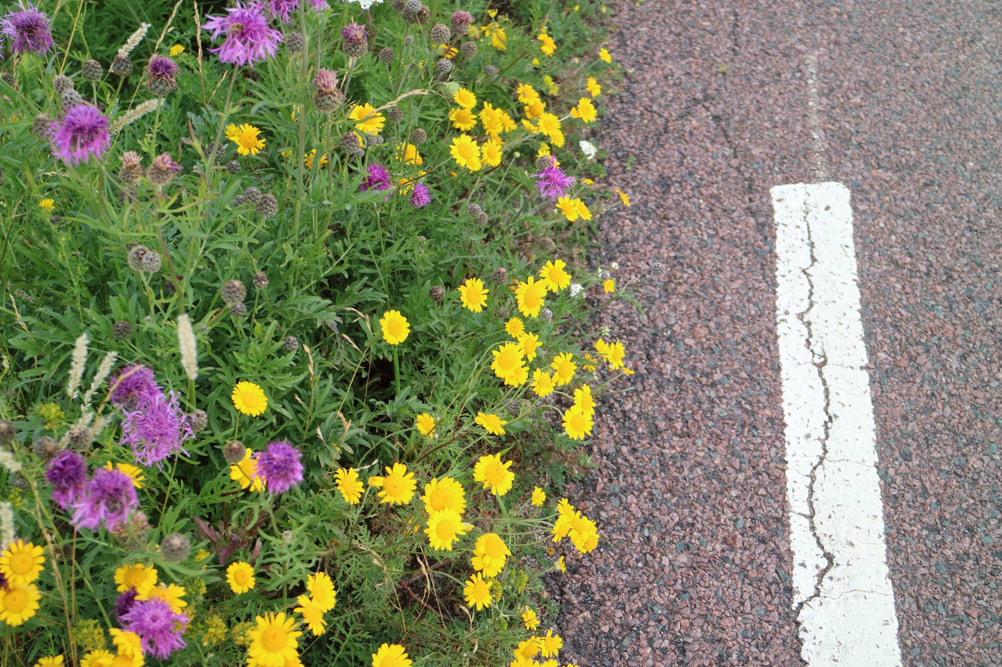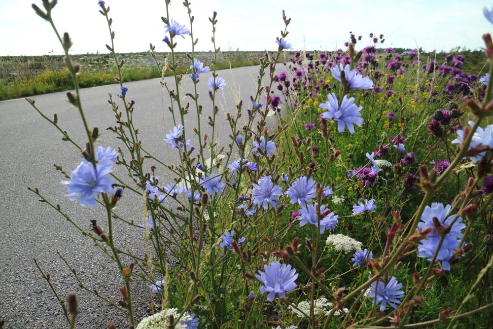 Utefter 136:an ser man oftast en kombination av cikoria (blått) och ängssyra (brunrött), vilken är de vanligaste vägkantsblommorna.