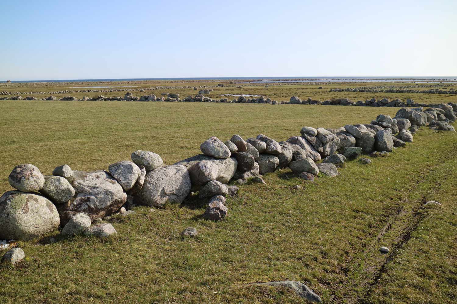 Nere vid kusten ligger byns sjöbodar i ett vackert öppet landskap omgivet av otaliga stenmurar.