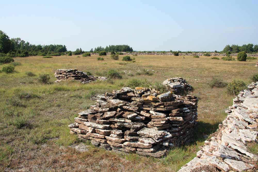 Vid sidan om vallen finns två kvadratiska stenbyggnader uppförda av 0,2-1 m kalkstenshällar i kallmur. Enligt uppgift är stenbyggnaderna kvarlämnade varulager av kalkstenshällar s k "palmar" upplagda på detta sätt.