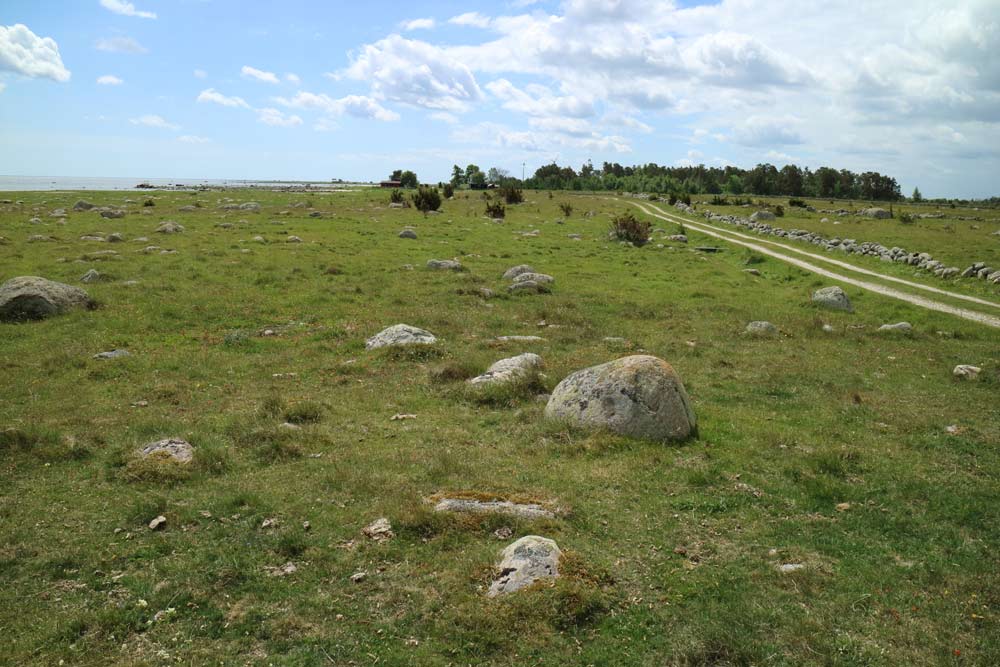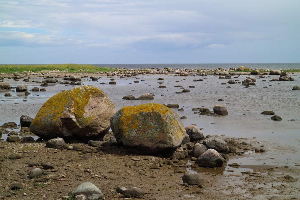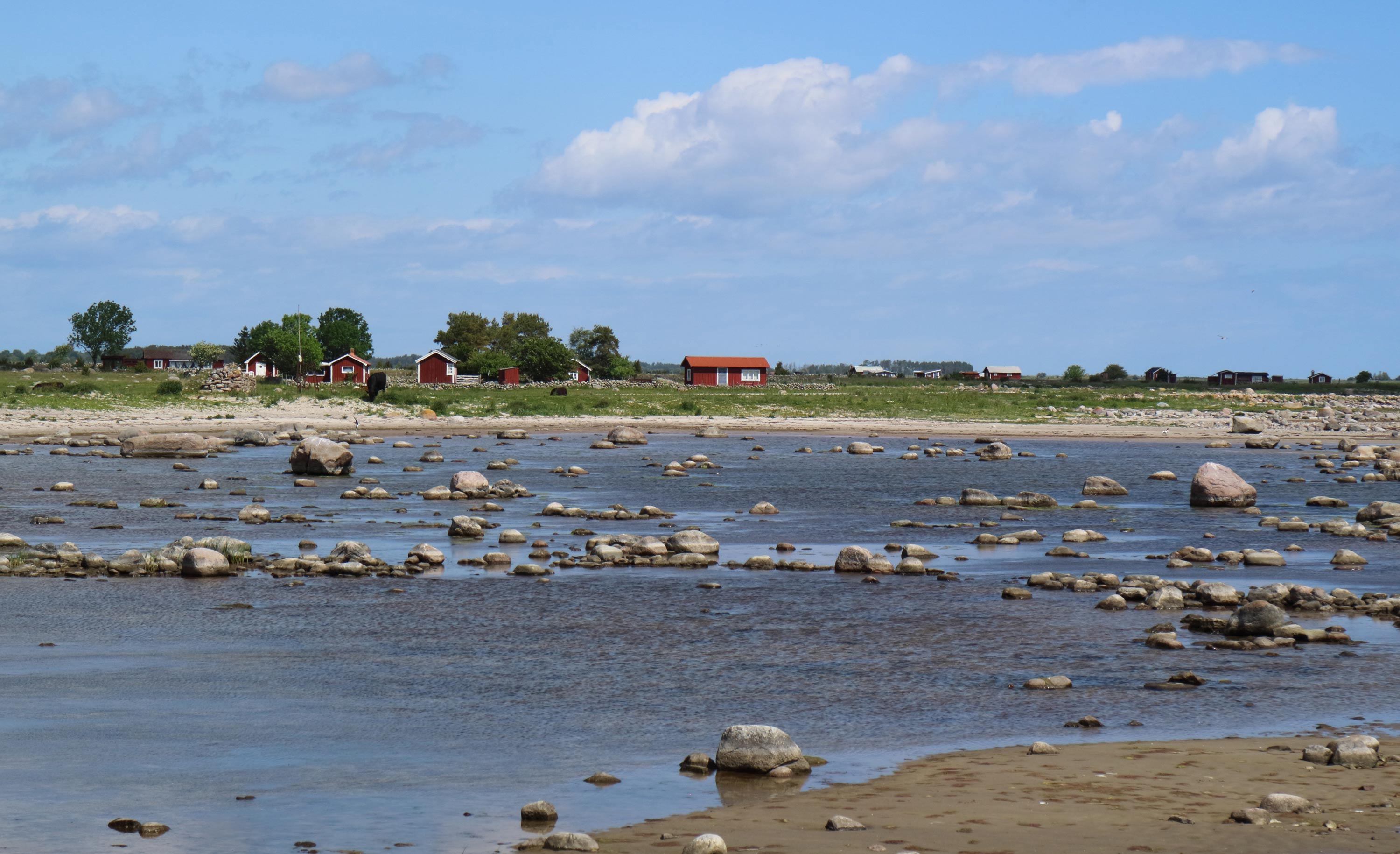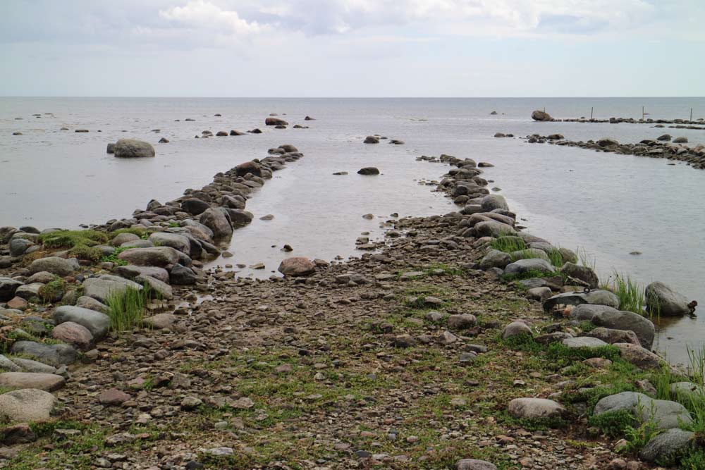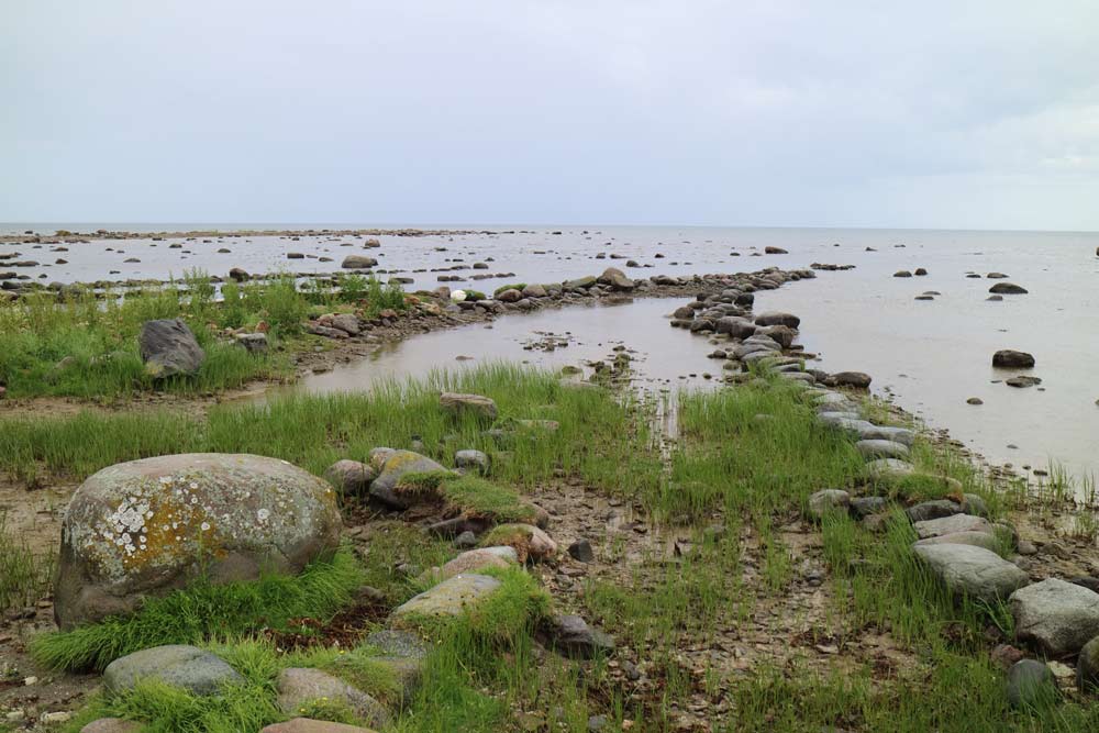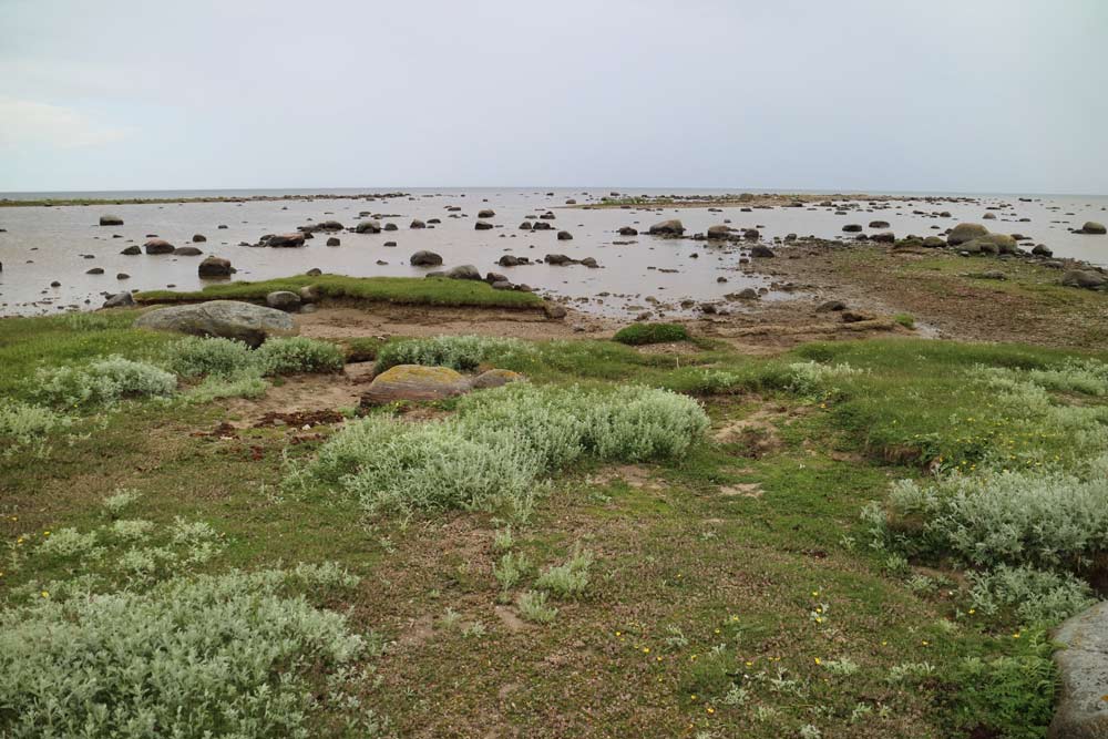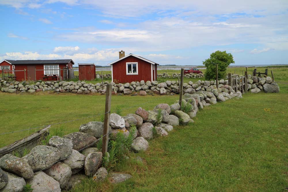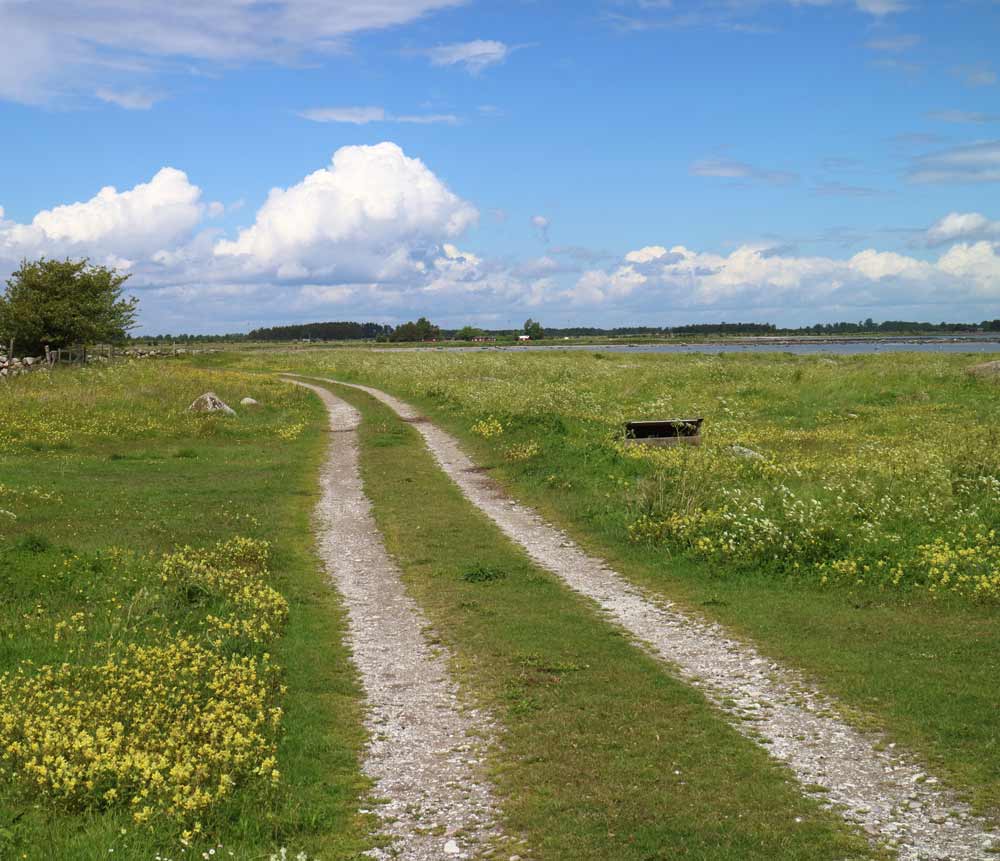 En liten väg passerar vid stranden som på några ställen har fiskebodar.