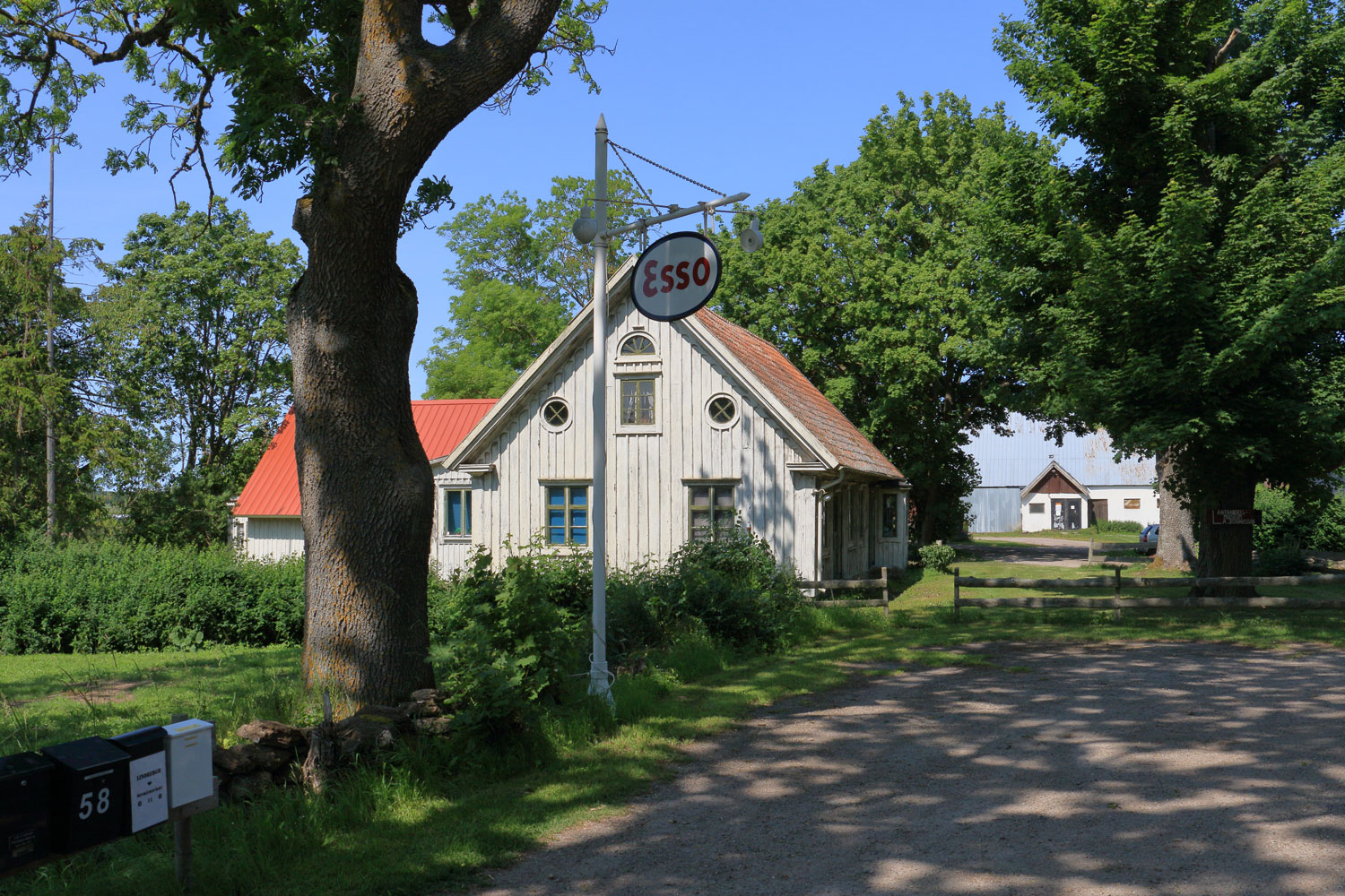 Här fanns en Esso-mack en gång vid handelsboden. Numera finns bara Esso-skylten kvar.