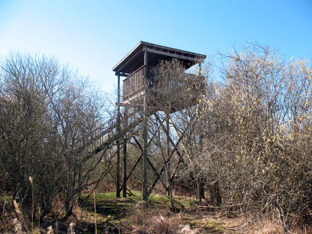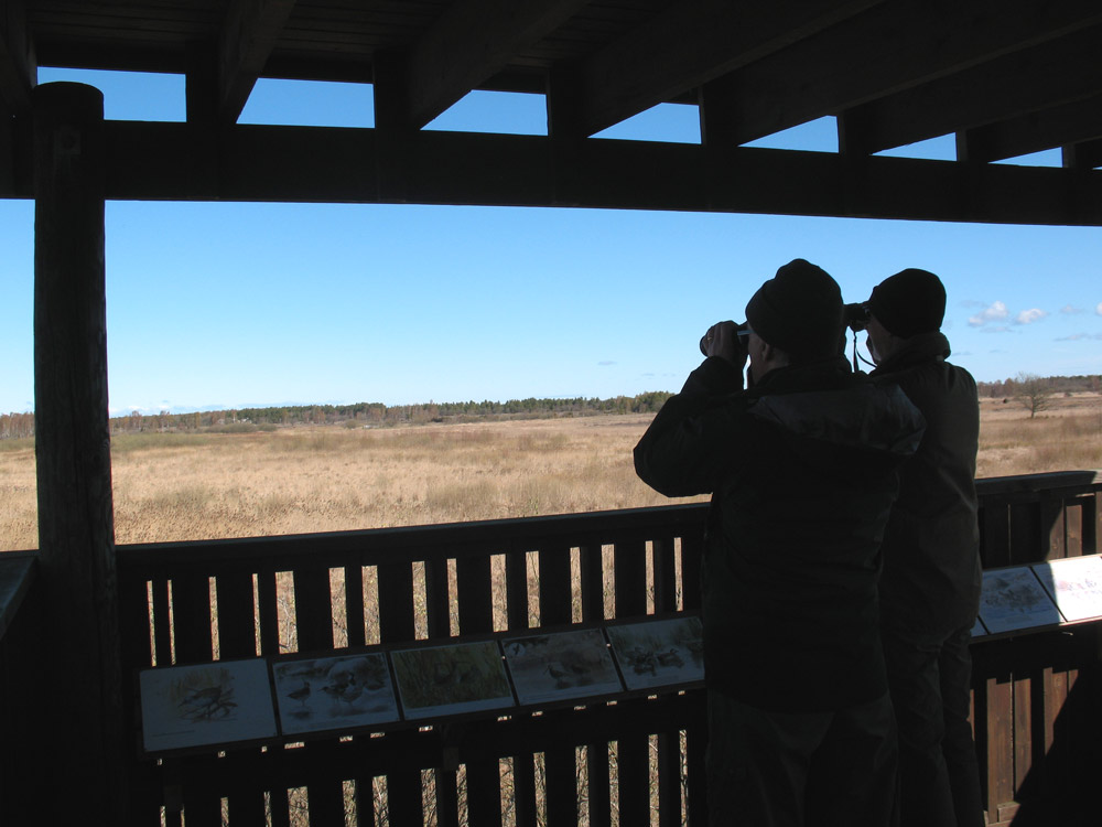Fågeltorn med utsikt över Petgärde träsk. En markerad stig leder från parkeringen till tornet.