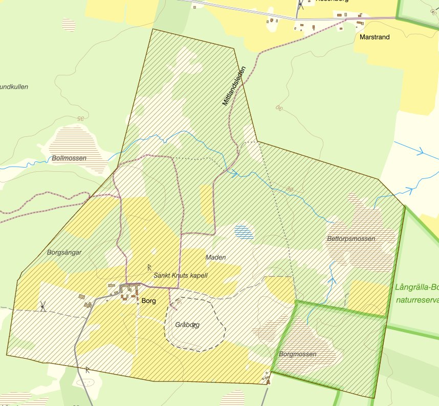 Innan borgen kan man gå till vänster ut i de mycket välhävdade lövängarna, Borgs ängar och rasta vid en väl utrustad rast/grillplats.