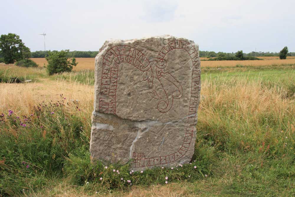Till vikingatidens slutskede hör också den två meter höga runstenen på motsatta sidan av kvarnraden. Inskriften tillsammans med en dubbel drakslinga bär följande text: "Olaf och Gammal och Saxe reste denna sten efter Unn, sin fader, Geirvi lät efter sin make (göra) denna minnesvård. För Rike Unn hämnades Olaf vid miomu. Unn ägde här halva byn". Stenen har blivit flyttad och står idag upp och ned.
