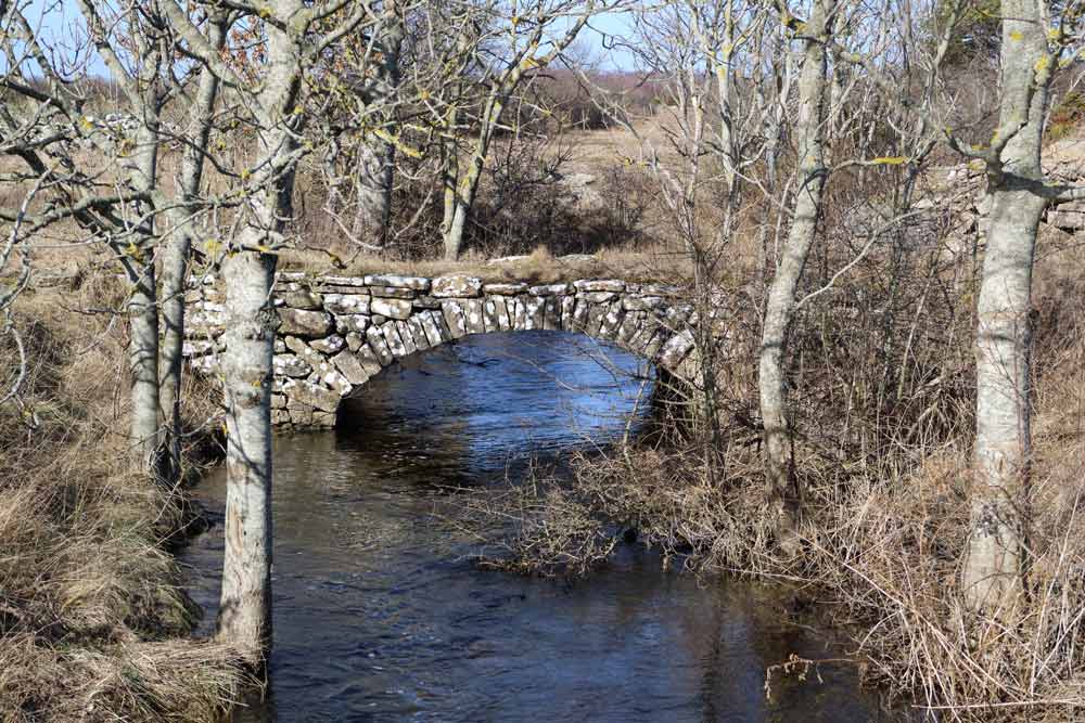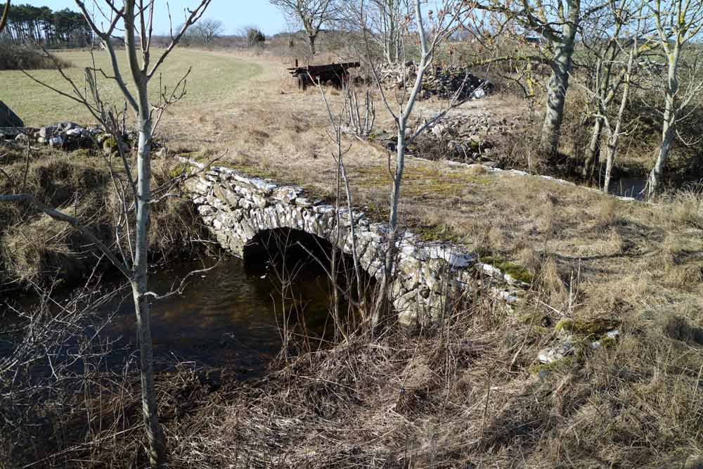 Liten stenvalvsbro vid Strandtorp över Pelnabrobäcken strax innan utloppet i Östersjön.
