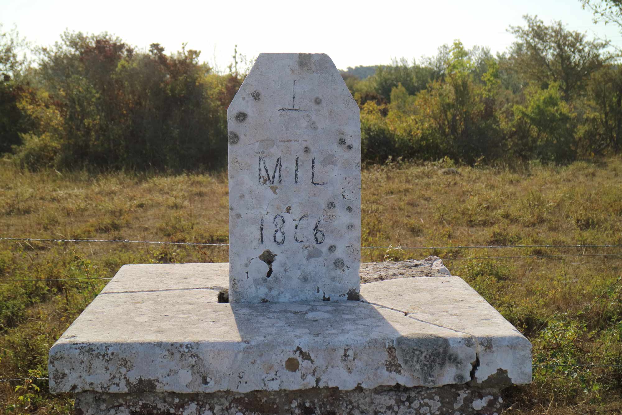 Milstenen står söder om Borgholm vid en parkeringsplats på östra sidan av 136:an (norrgående fordon). Text: " 1 MIL 1866". Parkeringsplatsen är en del av den gamla vägsträckningen.